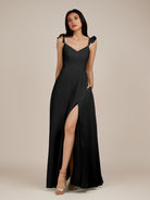 Citrine | Black - A Line V Neck Chiffon Ruffled Long Bridesmaid Dress with Slit