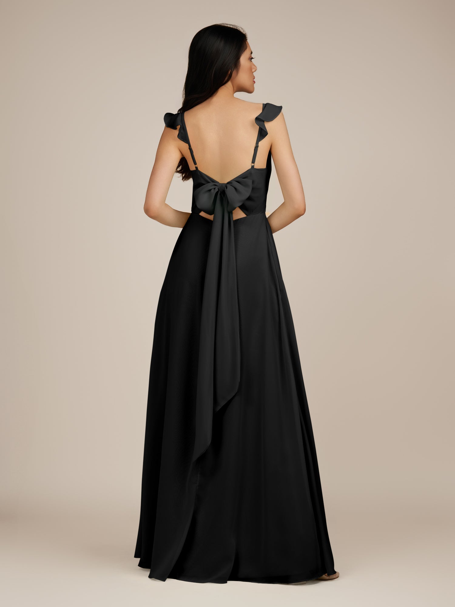Citrine is a graceful and stylish choice for your bridal party. Crafted from soft chiffon, she features a flattering V-neckline and a sleeveless bodice for a modern, elegant look. Her floor-length A-line skirt flows beautifully with every step, accented by delicate ruffles and a subtle side slit for added movement and charm. Finished with a smooth zipper back, Citrine blends timeless sophistication with contemporary style, perfect for weddings and special occasions.