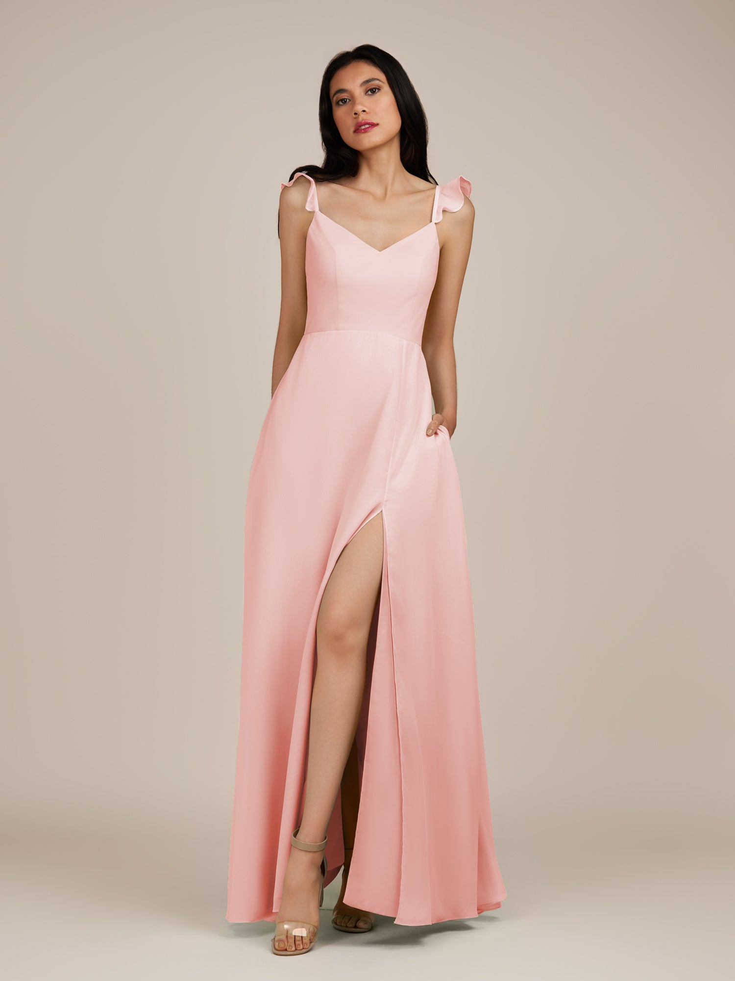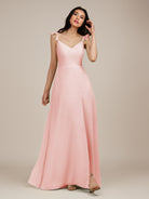 Citrine | Blush Pink - A Line V Neck Chiffon Ruffled Long Bridesmaid Dress with Slit