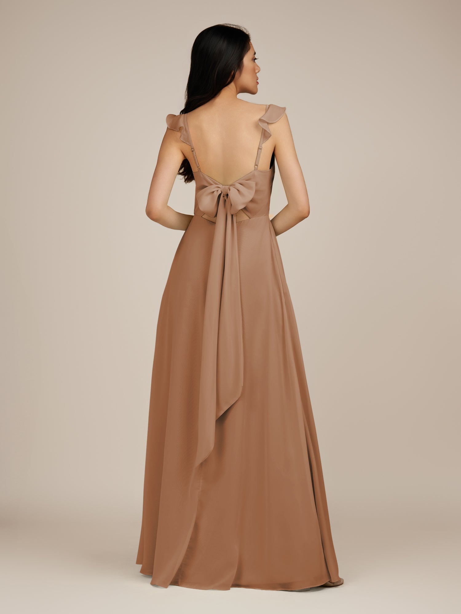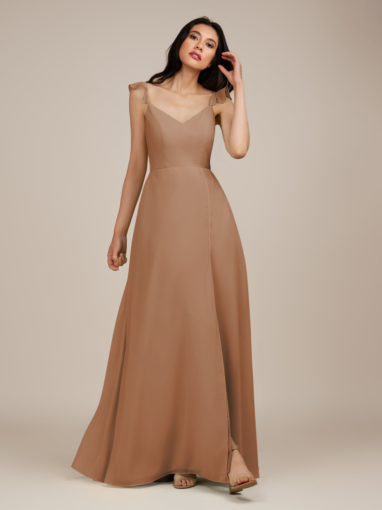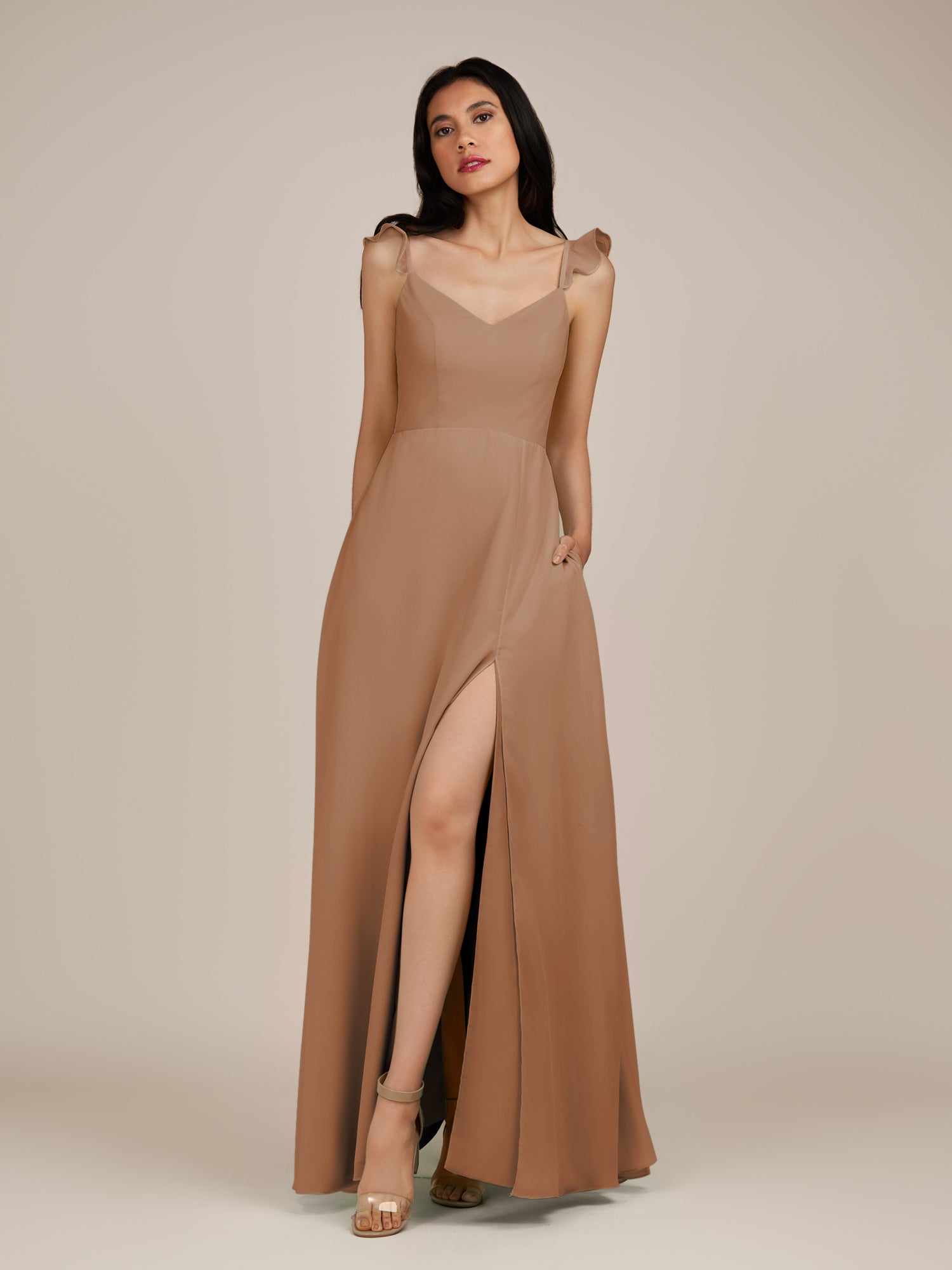 Citrine is a graceful and stylish choice for your bridal party. Crafted from soft chiffon, she features a flattering V-neckline and a sleeveless bodice for a modern, elegant look. Her floor-length A-line skirt flows beautifully with every step, accented by delicate ruffles and a subtle side slit for added movement and charm. Finished with a smooth zipper back, Citrine blends timeless sophistication with contemporary style, perfect for weddings and special occasions.