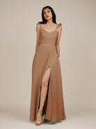 Citrine | Bronzer - A Line V Neck Chiffon Ruffled Long Bridesmaid Dress with Slit