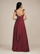 Citrine | Burgundy - A Line V Neck Chiffon Ruffled Long Bridesmaid Dress with Slit
