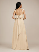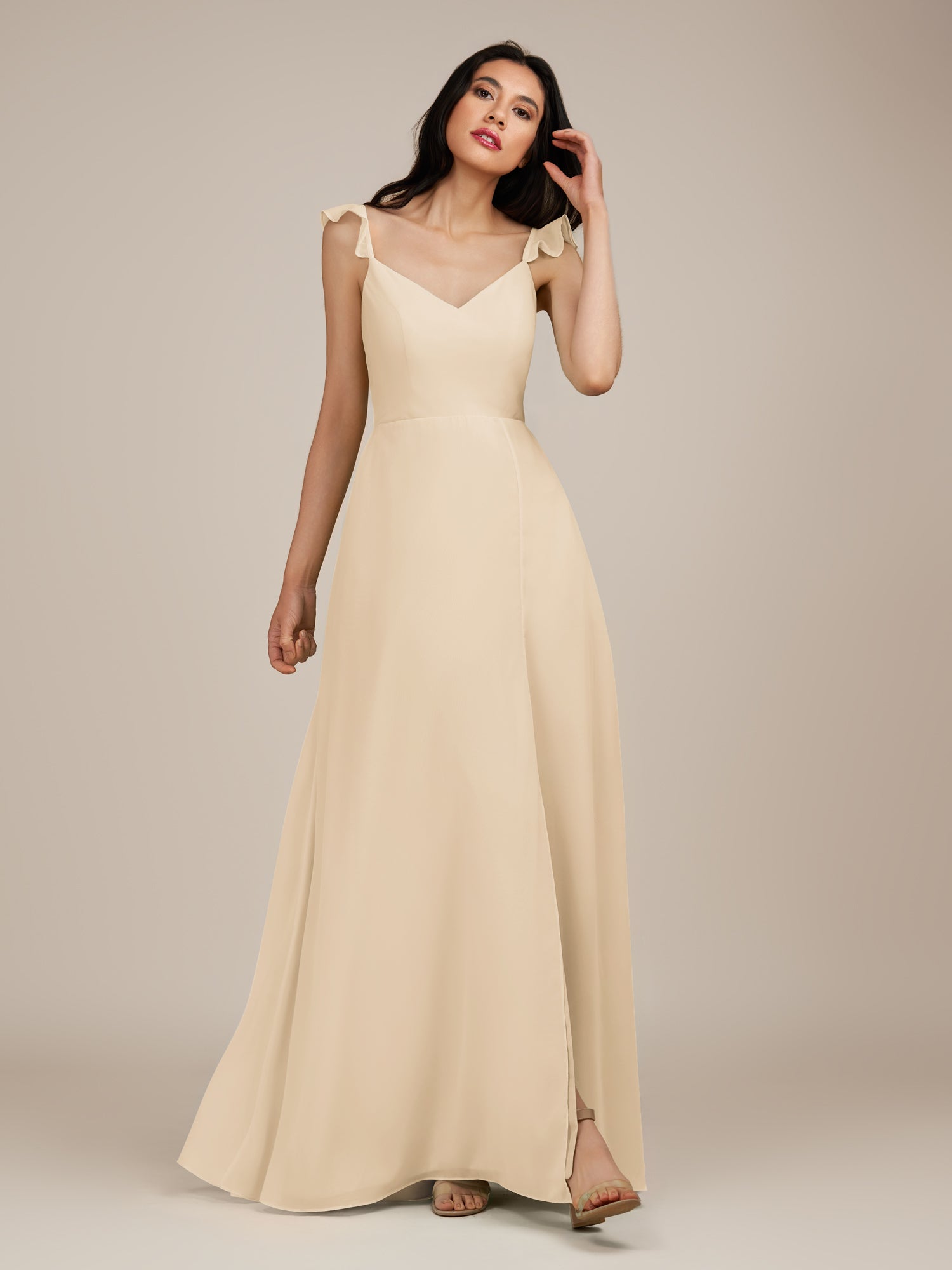 Citrine | Champagne - A Line V Neck Chiffon Ruffled Long Bridesmaid Dress with Slit