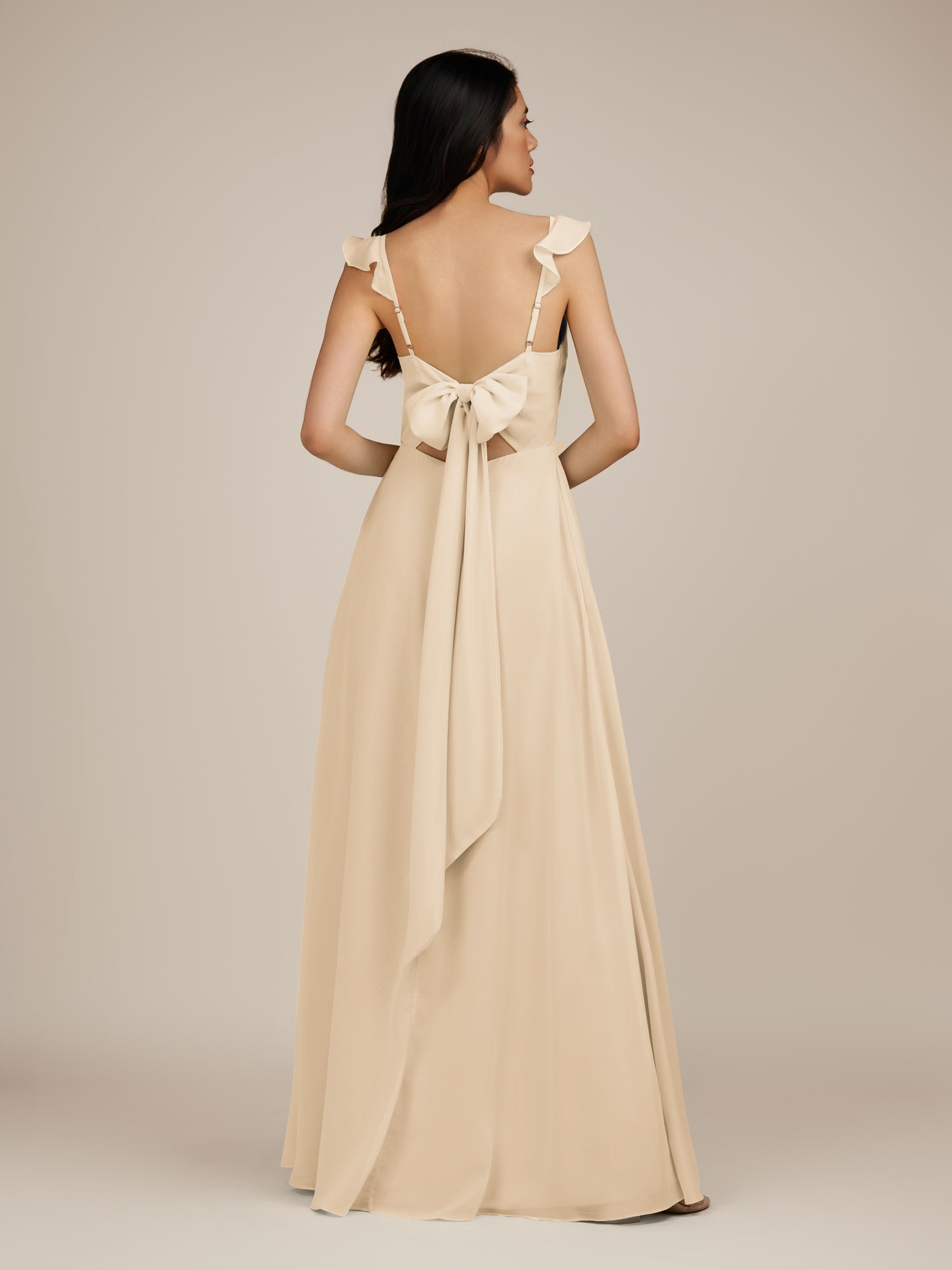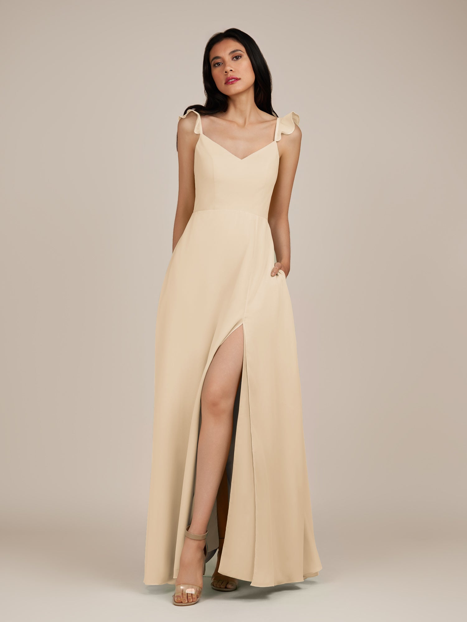 Citrine is a graceful and stylish choice for your bridal party. Crafted from soft chiffon, she features a flattering V-neckline and a sleeveless bodice for a modern, elegant look. Her floor-length A-line skirt flows beautifully with every step, accented by delicate ruffles and a subtle side slit for added movement and charm. Finished with a smooth zipper back, Citrine blends timeless sophistication with contemporary style, perfect for weddings and special occasions.