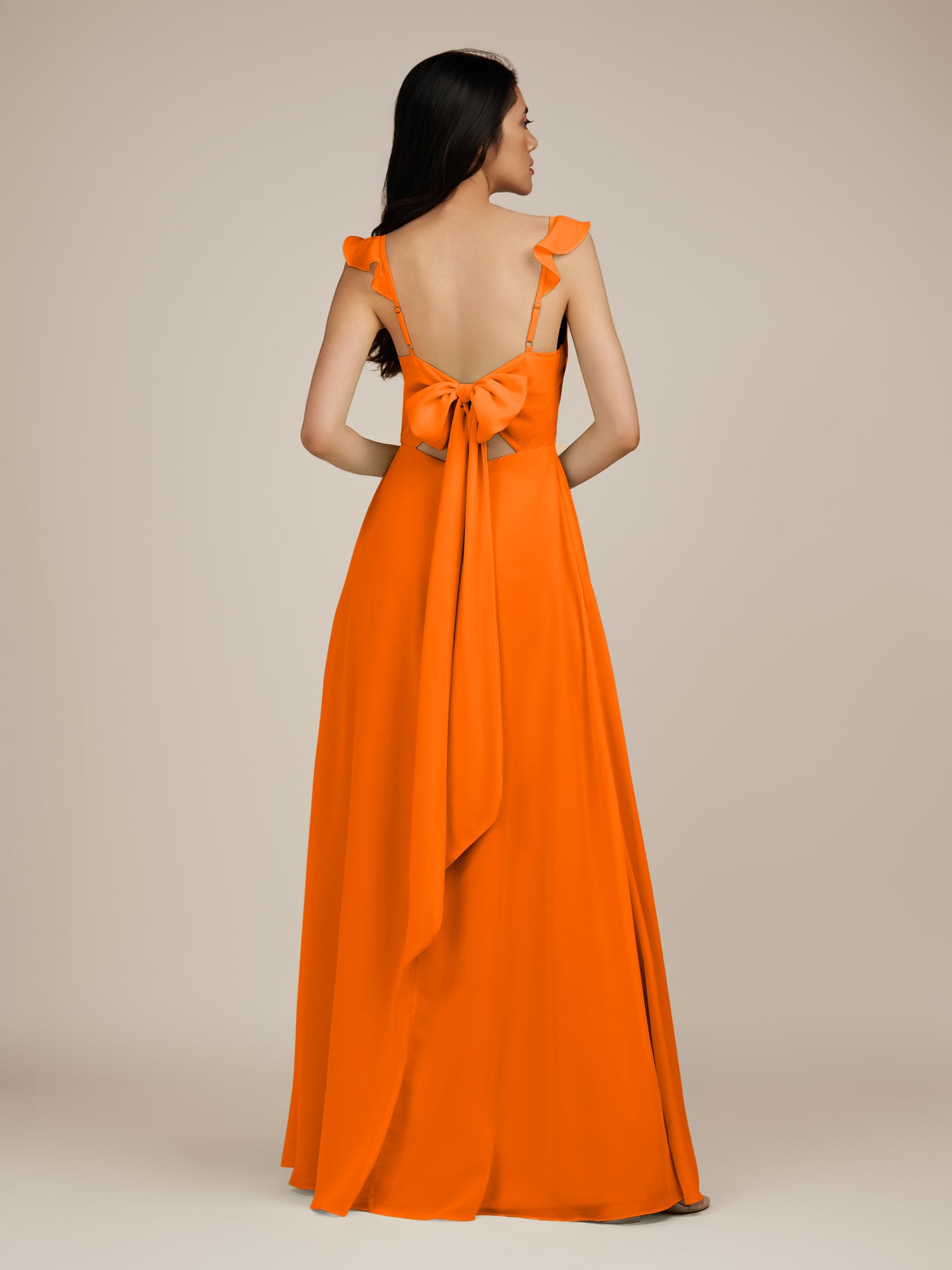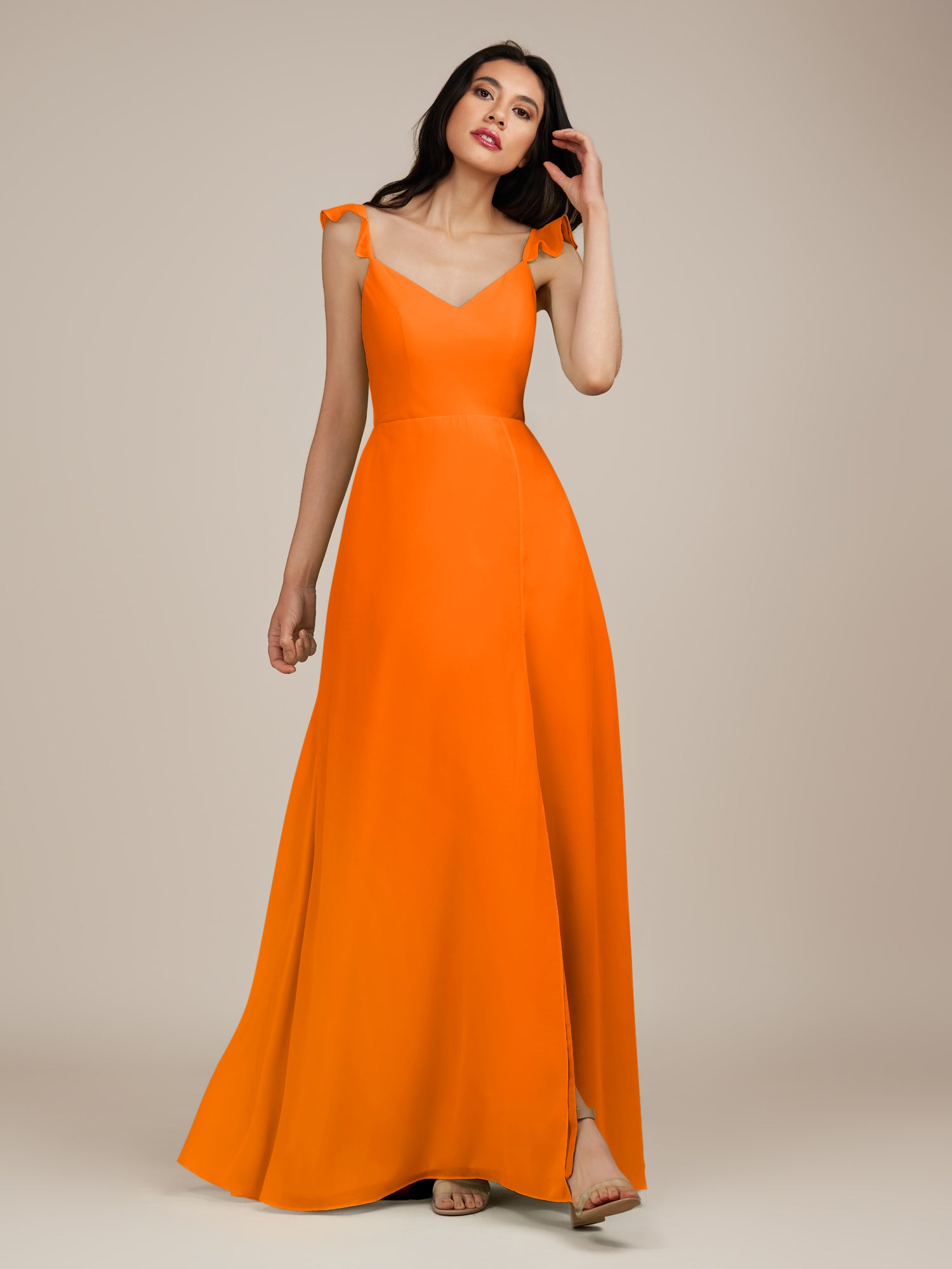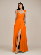 Citrine is a graceful and stylish choice for your bridal party. Crafted from soft chiffon, she features a flattering V-neckline and a sleeveless bodice for a modern, elegant look. Her floor-length A-line skirt flows beautifully with every step, accented by delicate ruffles and a subtle side slit for added movement and charm. Finished with a smooth zipper back, Citrine blends timeless sophistication with contemporary style, perfect for weddings and special occasions.