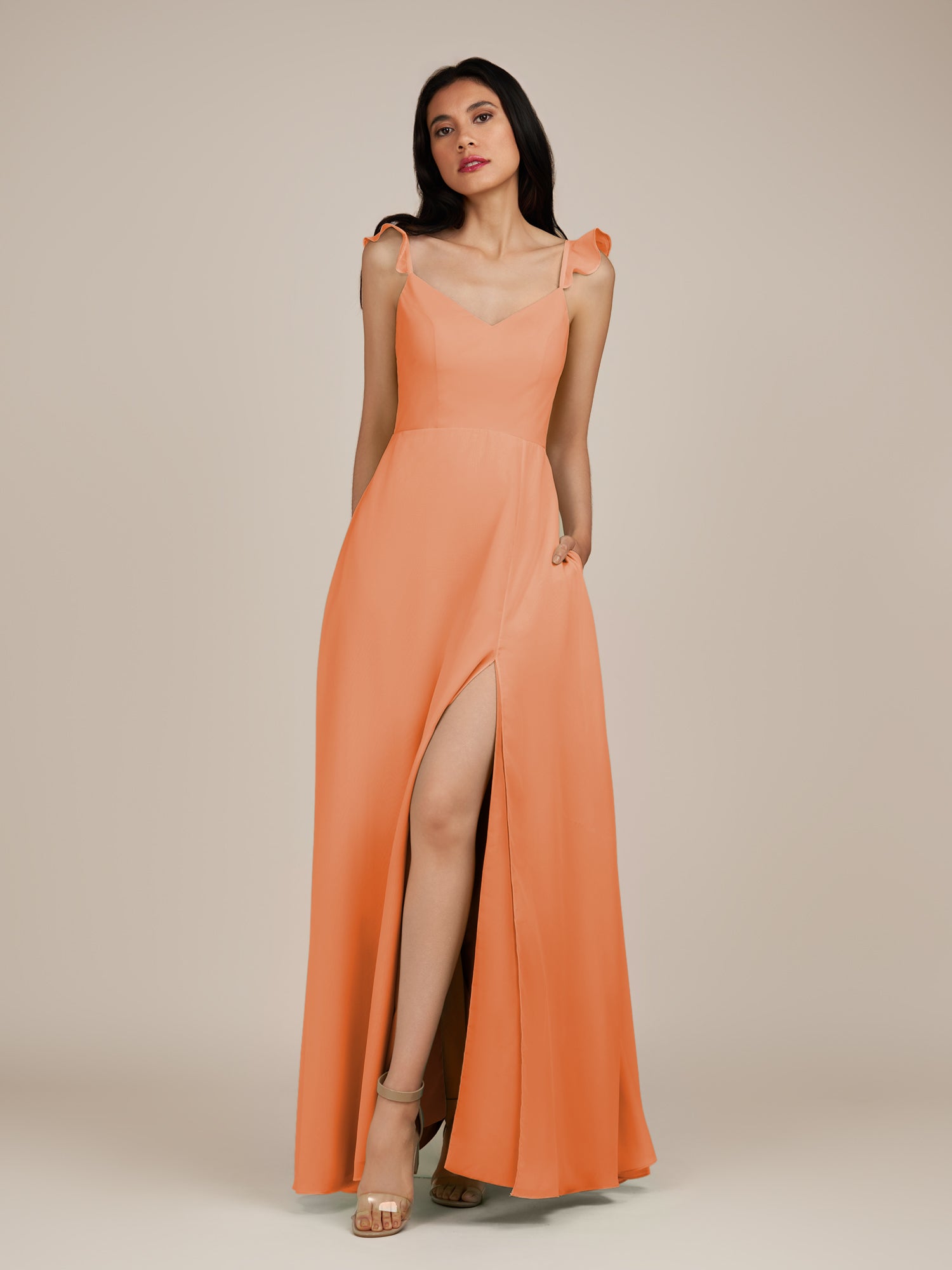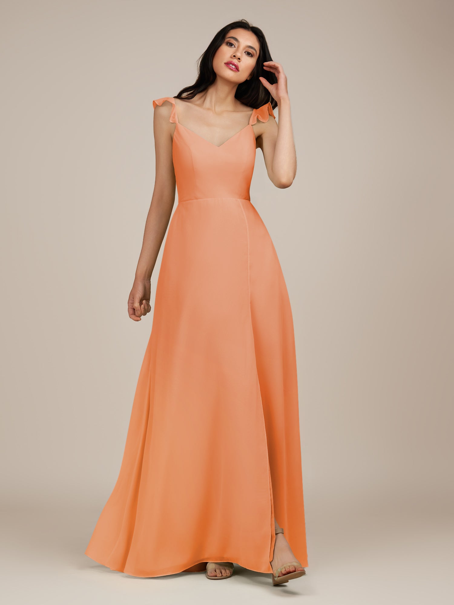 Citrine | Coral - A Line V Neck Chiffon Ruffled Long Bridesmaid Dress with Slit