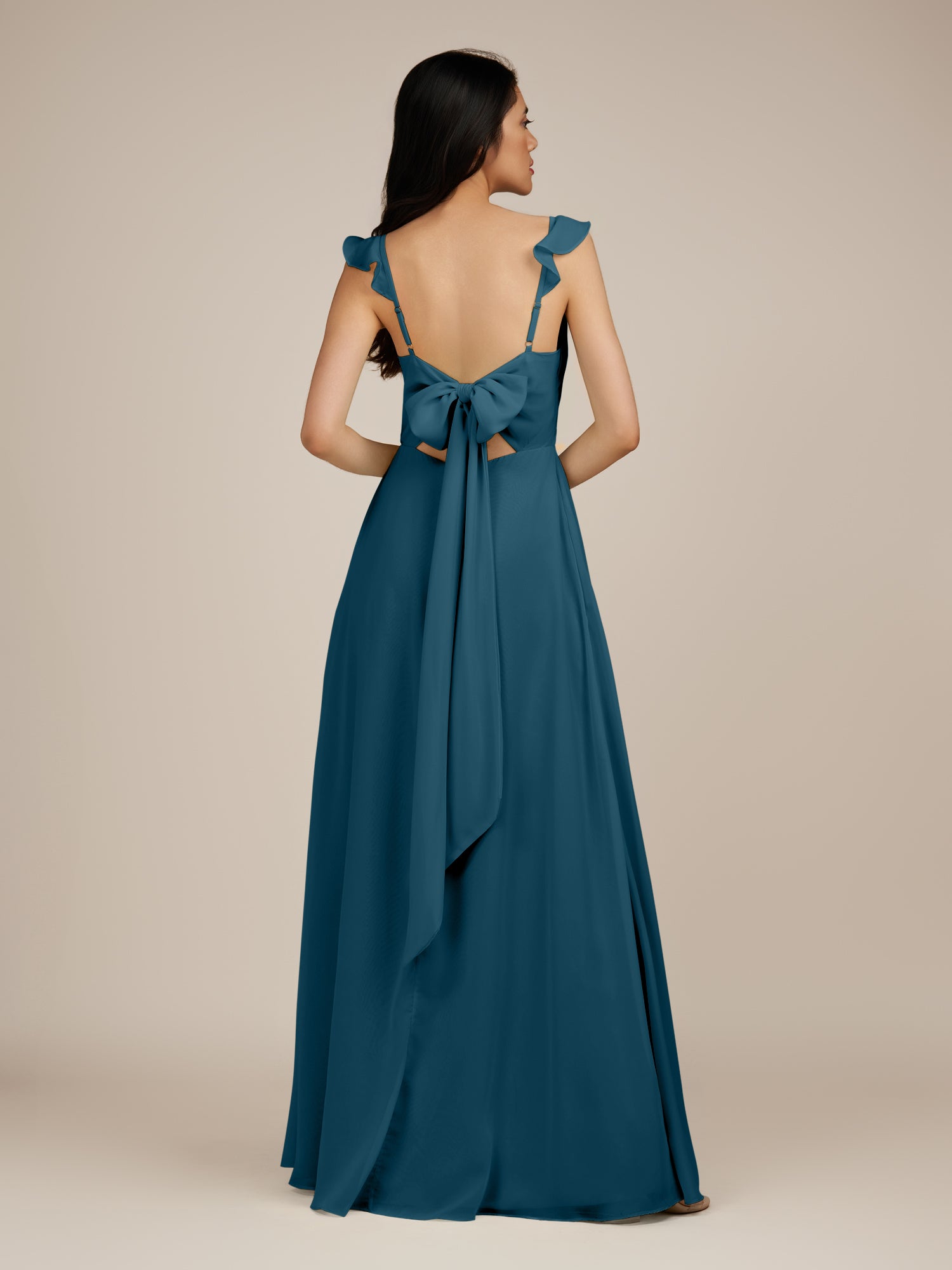 Citrine is a graceful and stylish choice for your bridal party. Crafted from soft chiffon, she features a flattering V-neckline and a sleeveless bodice for a modern, elegant look. Her floor-length A-line skirt flows beautifully with every step, accented by delicate ruffles and a subtle side slit for added movement and charm. Finished with a smooth zipper back, Citrine blends timeless sophistication with contemporary style, perfect for weddings and special occasions.