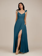 Citrine | Dark Teal - A Line V Neck Chiffon Ruffled Long Bridesmaid Dress with Slit