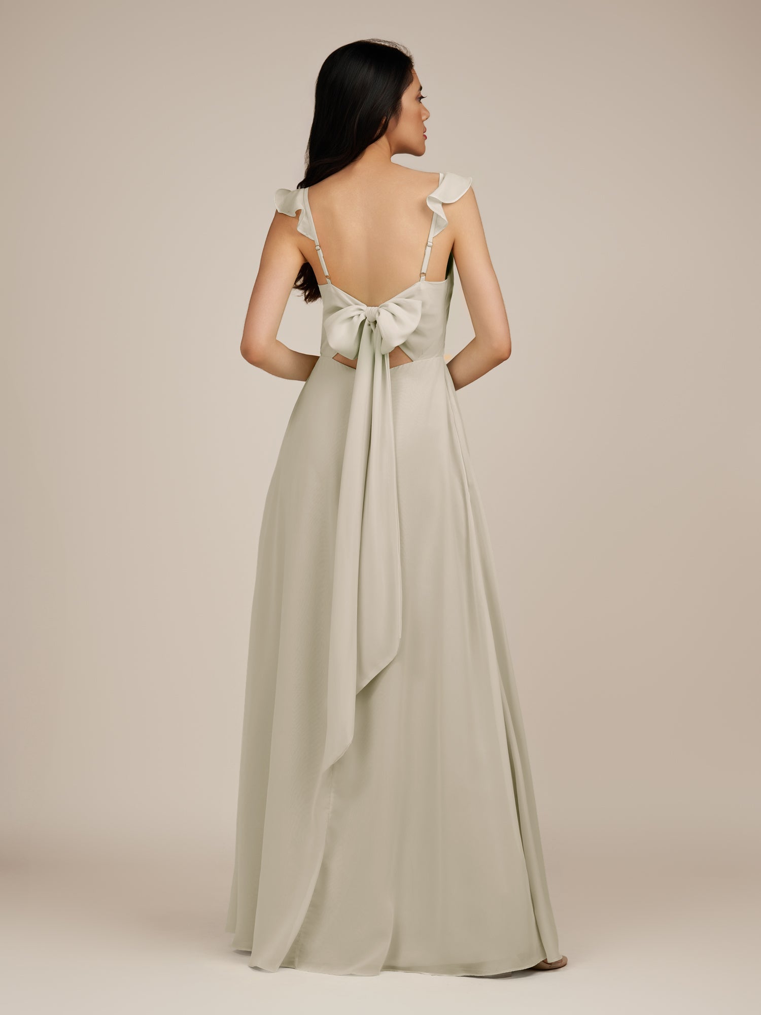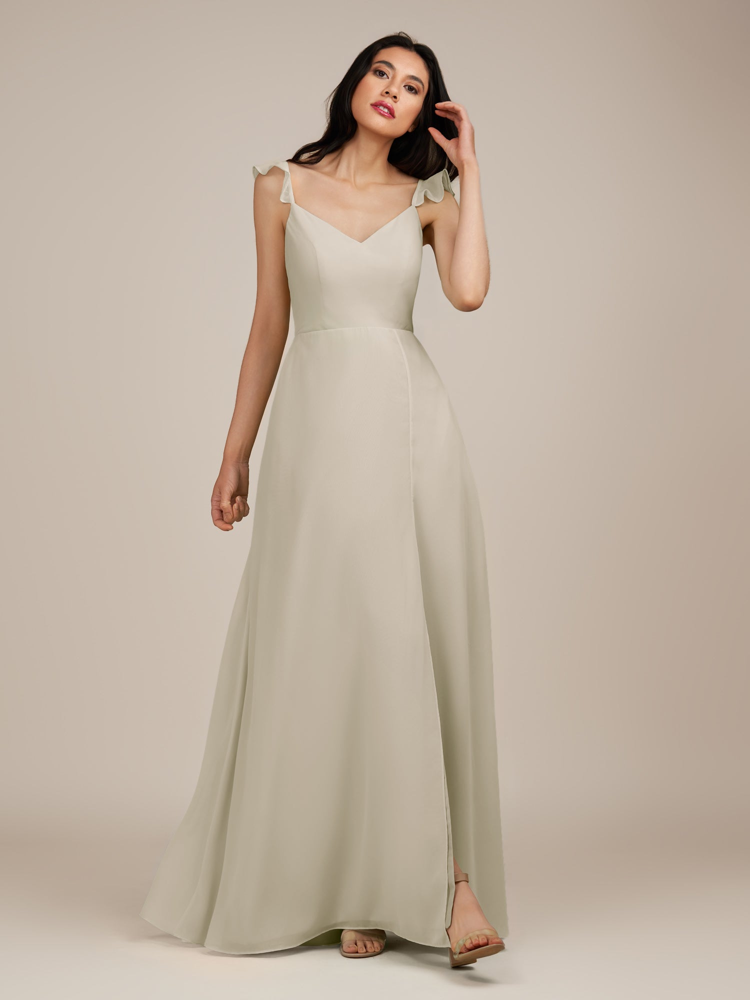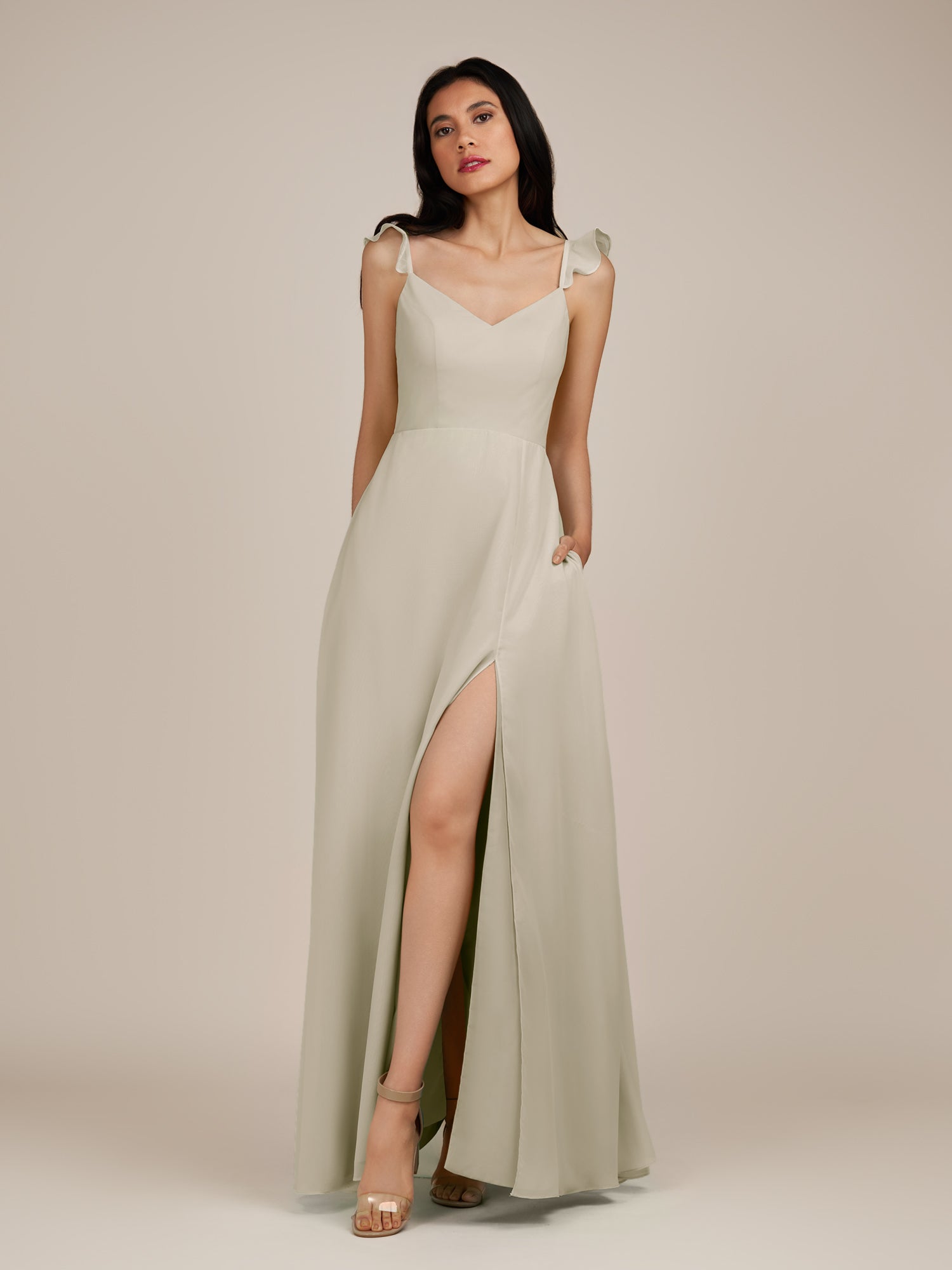 Citrine is a graceful and stylish choice for your bridal party. Crafted from soft chiffon, she features a flattering V-neckline and a sleeveless bodice for a modern, elegant look. Her floor-length A-line skirt flows beautifully with every step, accented by delicate ruffles and a subtle side slit for added movement and charm. Finished with a smooth zipper back, Citrine blends timeless sophistication with contemporary style, perfect for weddings and special occasions.