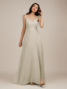 Citrine | Dove Gray - A Line V Neck Chiffon Ruffled Long Bridesmaid Dress with Slit
