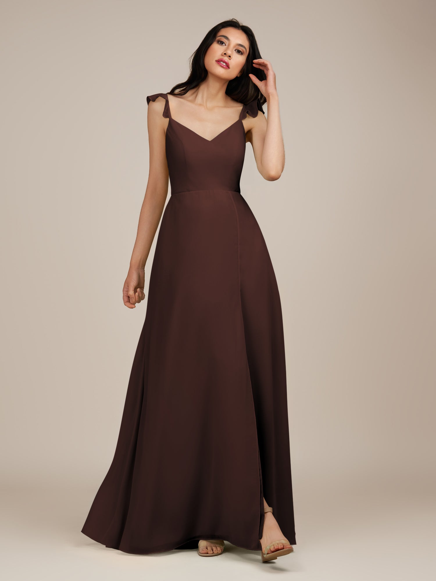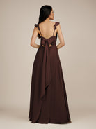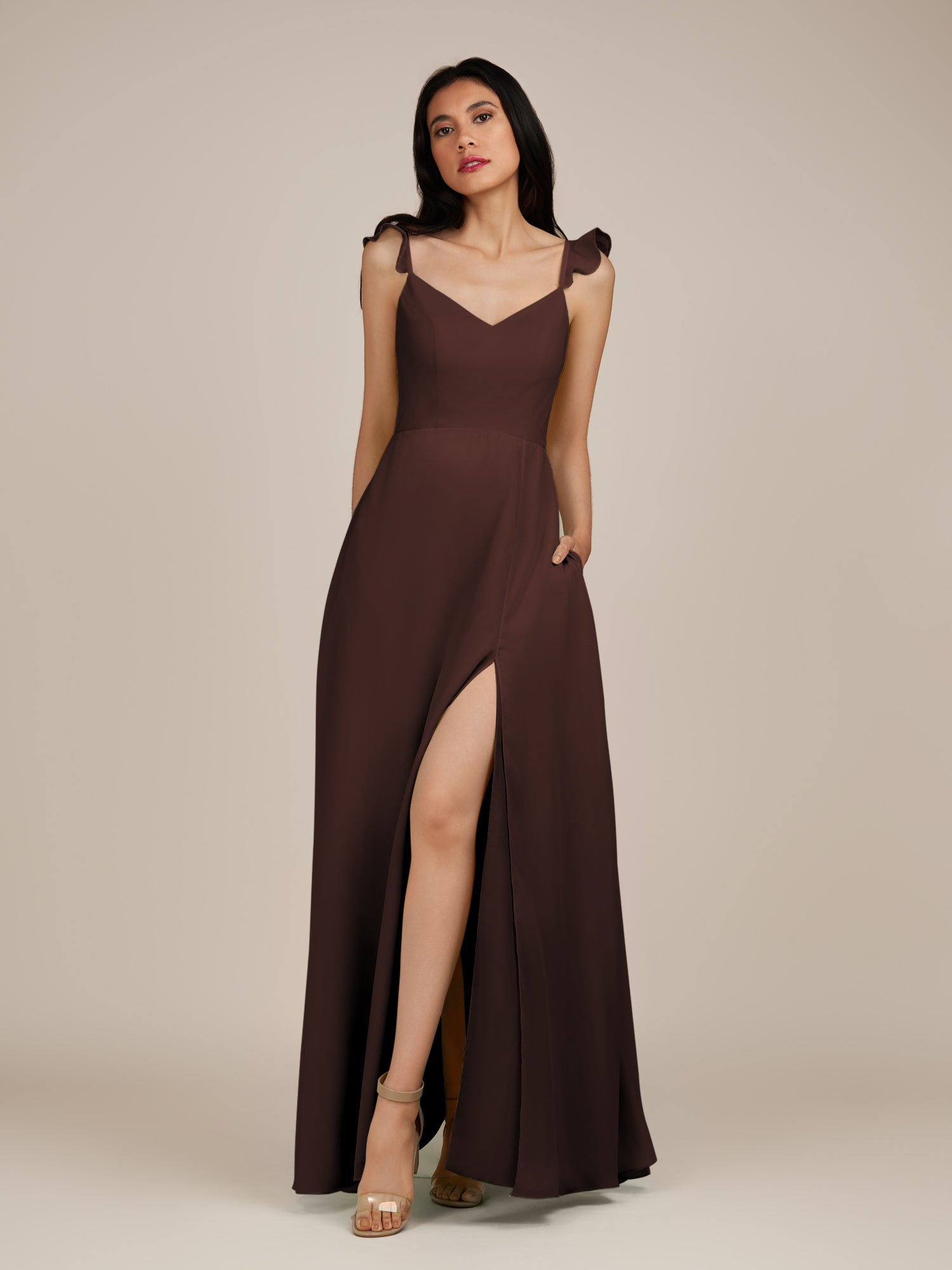 Citrine | Espresso - A Line V Neck Chiffon Ruffled Long Bridesmaid Dress with Slit