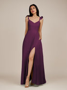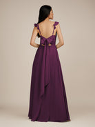 Citrine | Fig - A Line V Neck Chiffon Ruffled Long Bridesmaid Dress with Slit