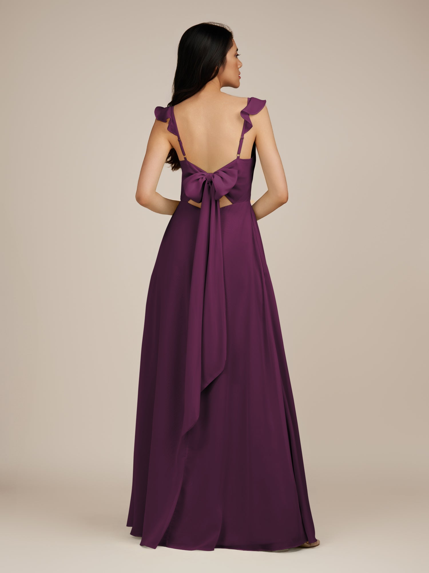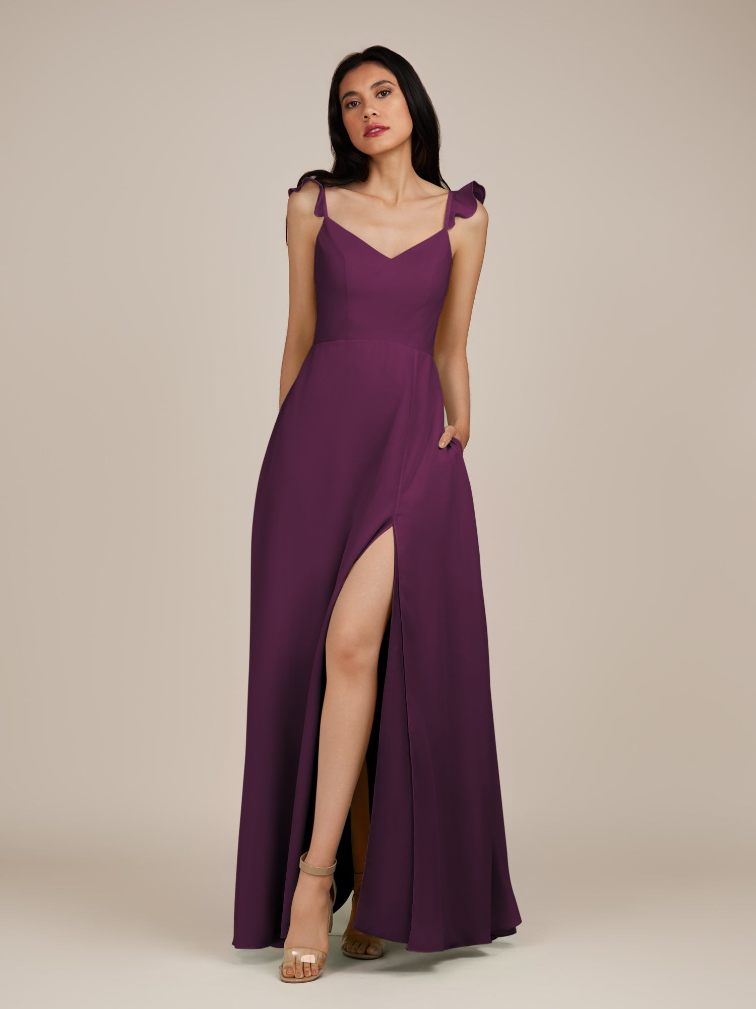 Citrine is a graceful and stylish choice for your bridal party. Crafted from soft chiffon, she features a flattering V-neckline and a sleeveless bodice for a modern, elegant look. Her floor-length A-line skirt flows beautifully with every step, accented by delicate ruffles and a subtle side slit for added movement and charm. Finished with a smooth zipper back, Citrine blends timeless sophistication with contemporary style, perfect for weddings and special occasions.