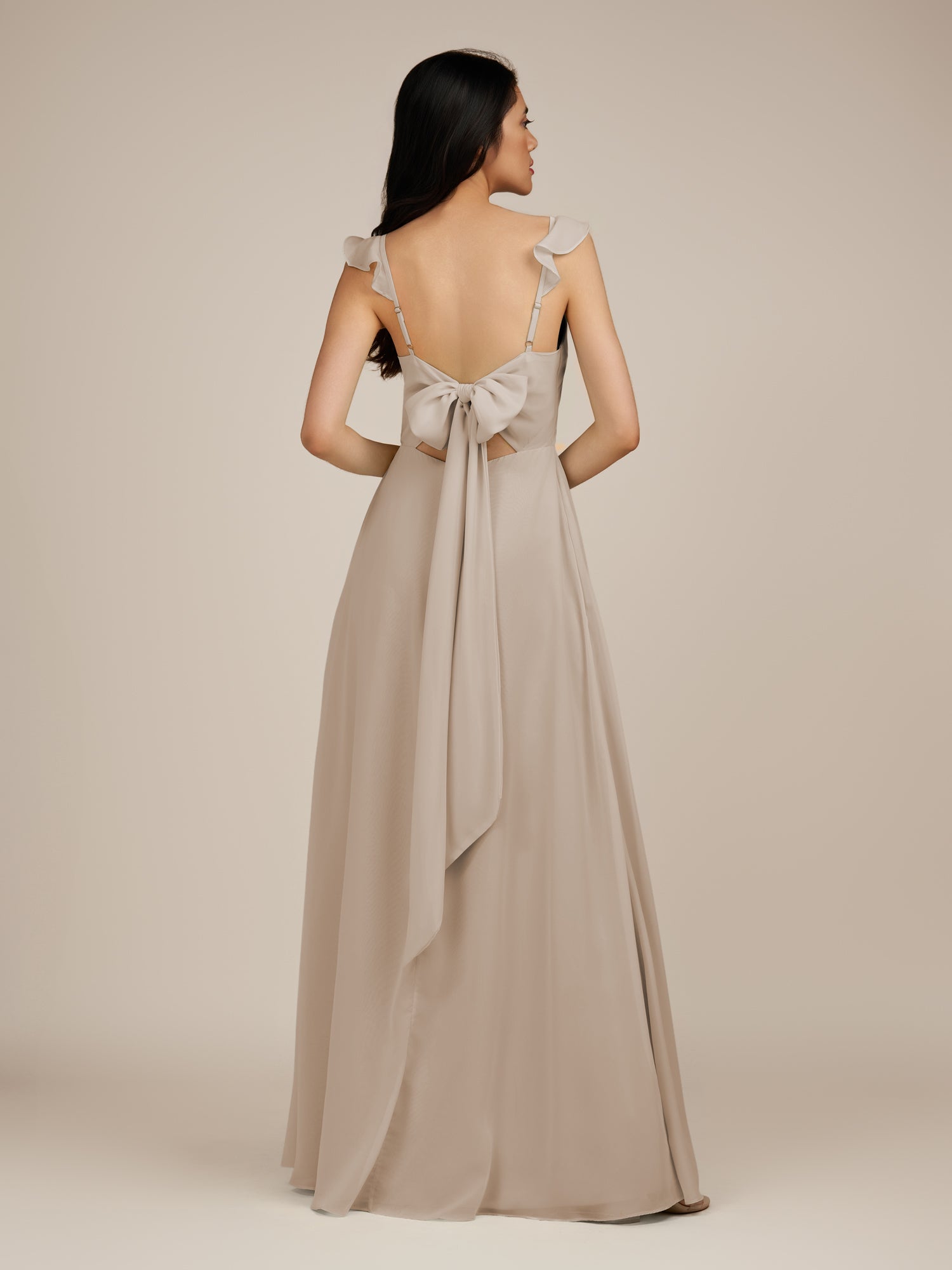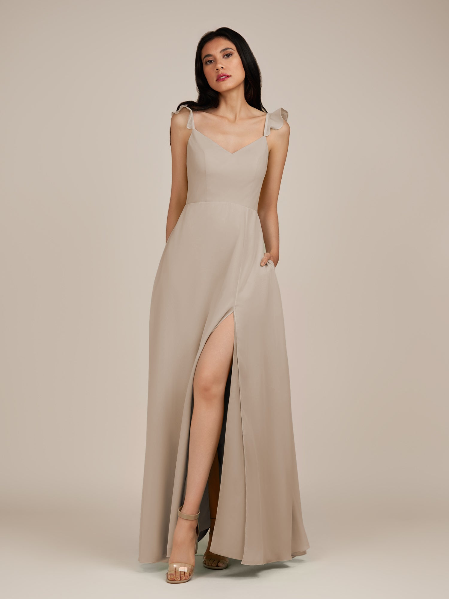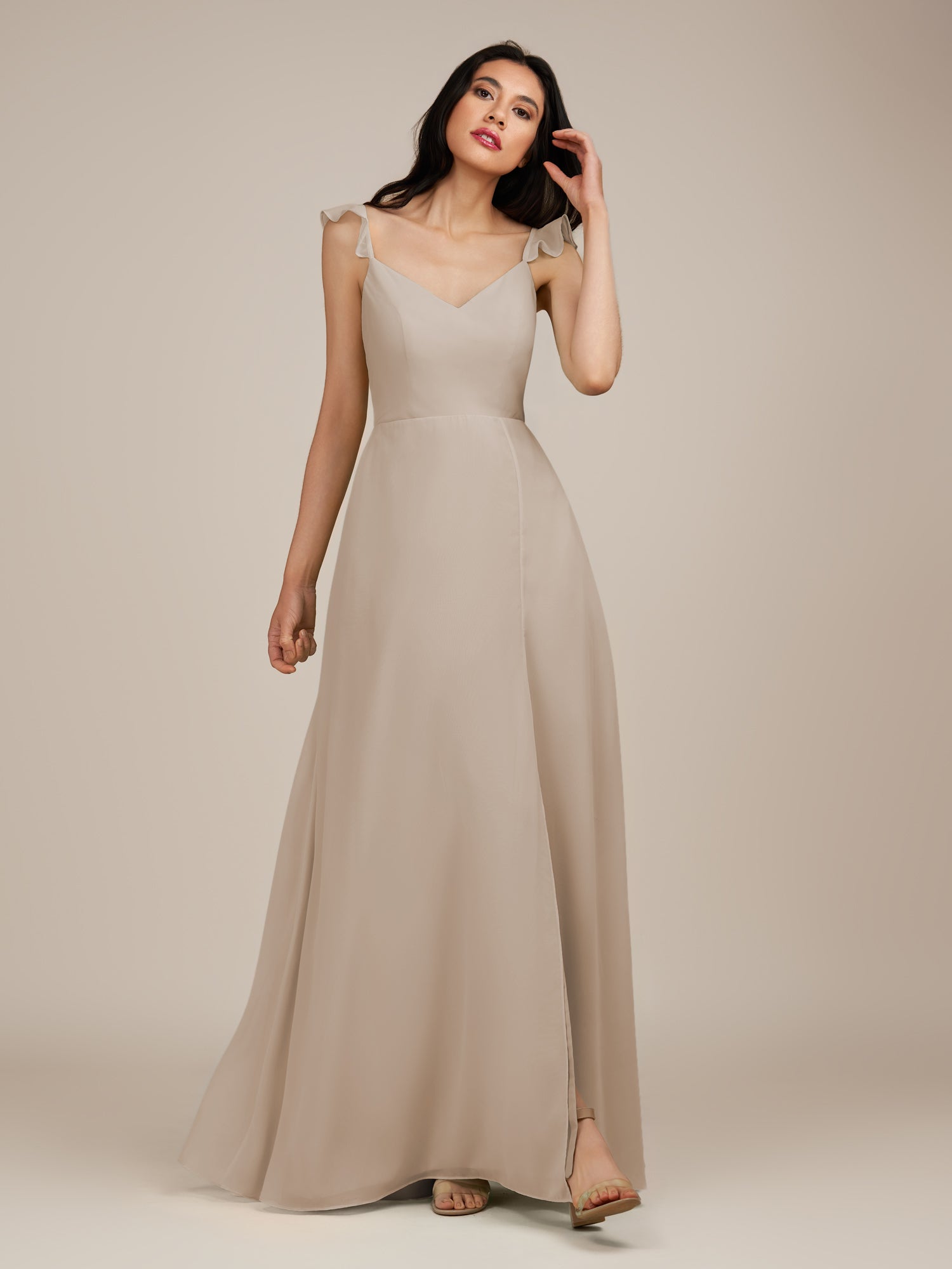 Citrine is a graceful and stylish choice for your bridal party. Crafted from soft chiffon, she features a flattering V-neckline and a sleeveless bodice for a modern, elegant look. Her floor-length A-line skirt flows beautifully with every step, accented by delicate ruffles and a subtle side slit for added movement and charm. Finished with a smooth zipper back, Citrine blends timeless sophistication with contemporary style, perfect for weddings and special occasions.