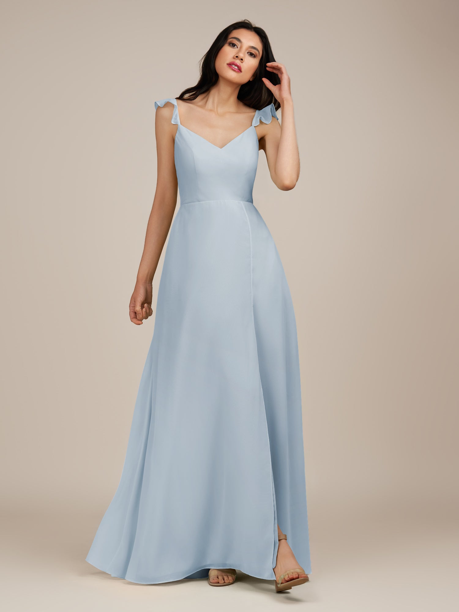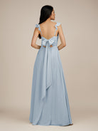 Citrine is a graceful and stylish choice for your bridal party. Crafted from soft chiffon, she features a flattering V-neckline and a sleeveless bodice for a modern, elegant look. Her floor-length A-line skirt flows beautifully with every step, accented by delicate ruffles and a subtle side slit for added movement and charm. Finished with a smooth zipper back, Citrine blends timeless sophistication with contemporary style, perfect for weddings and special occasions.