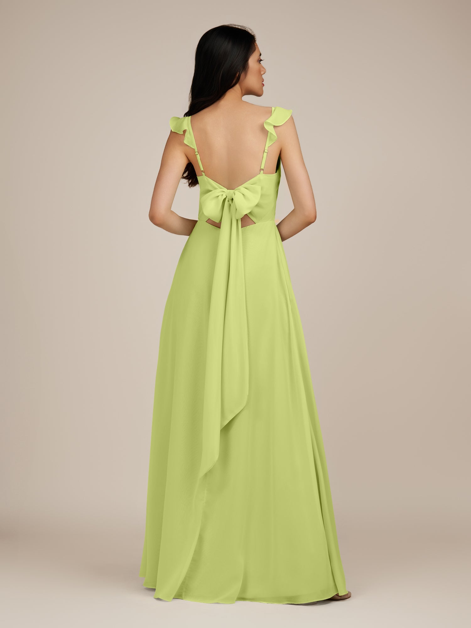 Citrine is a graceful and stylish choice for your bridal party. Crafted from soft chiffon, she features a flattering V-neckline and a sleeveless bodice for a modern, elegant look. Her floor-length A-line skirt flows beautifully with every step, accented by delicate ruffles and a subtle side slit for added movement and charm. Finished with a smooth zipper back, Citrine blends timeless sophistication with contemporary style, perfect for weddings and special occasions.