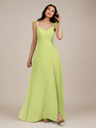 Citrine | Lemon Sorbet - A Line V Neck Chiffon Ruffled Long Bridesmaid Dress with Slit