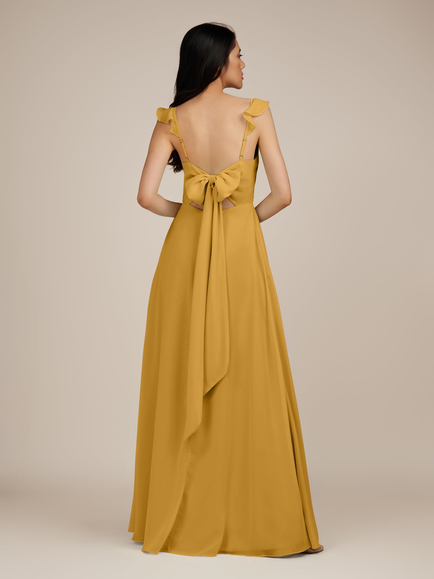 Citrine is a graceful and stylish choice for your bridal party. Crafted from soft chiffon, she features a flattering V-neckline and a sleeveless bodice for a modern, elegant look. Her floor-length A-line skirt flows beautifully with every step, accented by delicate ruffles and a subtle side slit for added movement and charm. Finished with a smooth zipper back, Citrine blends timeless sophistication with contemporary style, perfect for weddings and special occasions.