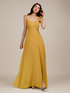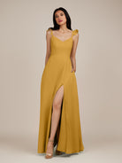 Citrine | Marigold - A Line V Neck Chiffon Ruffled Long Bridesmaid Dress with Slit