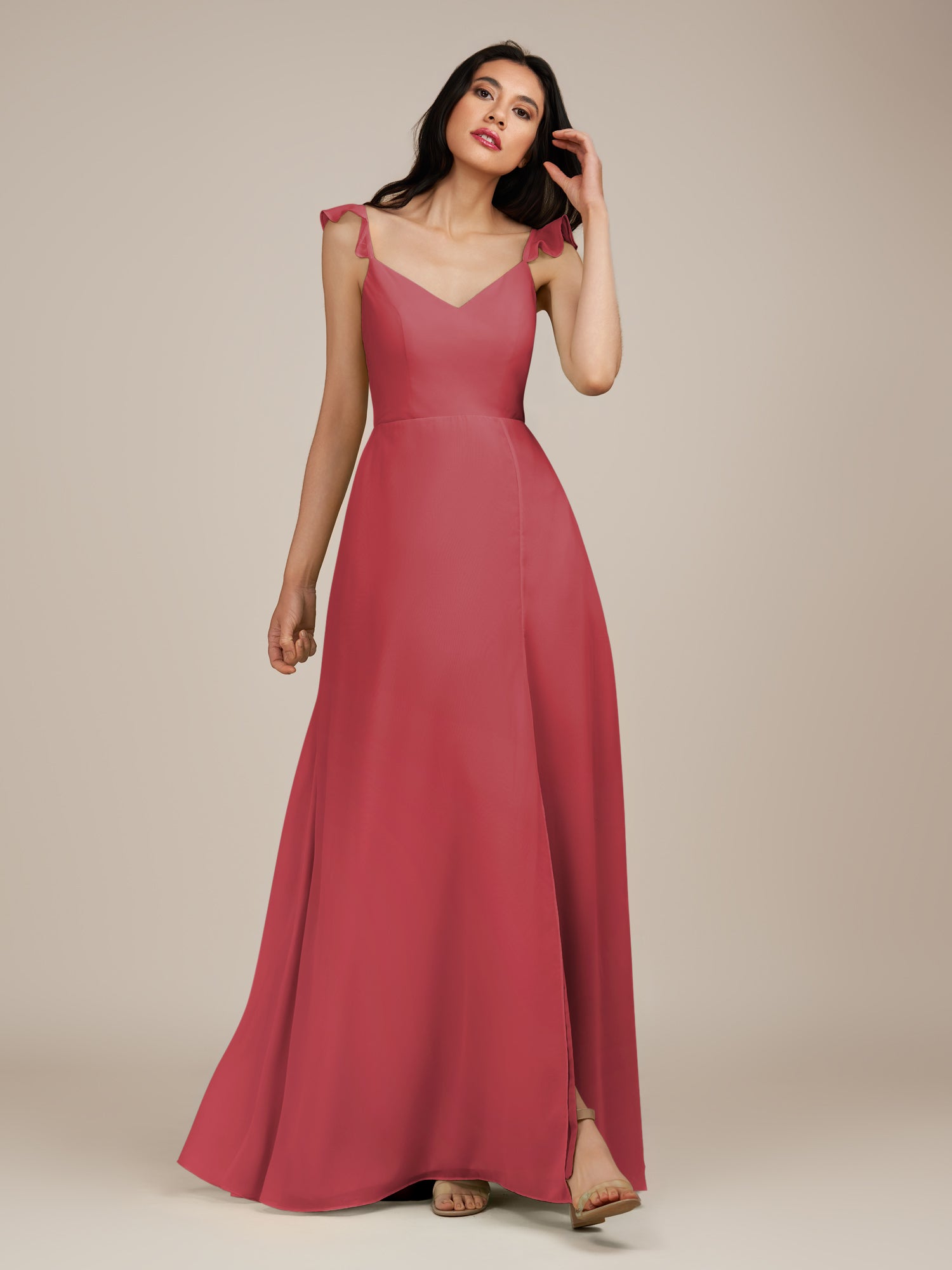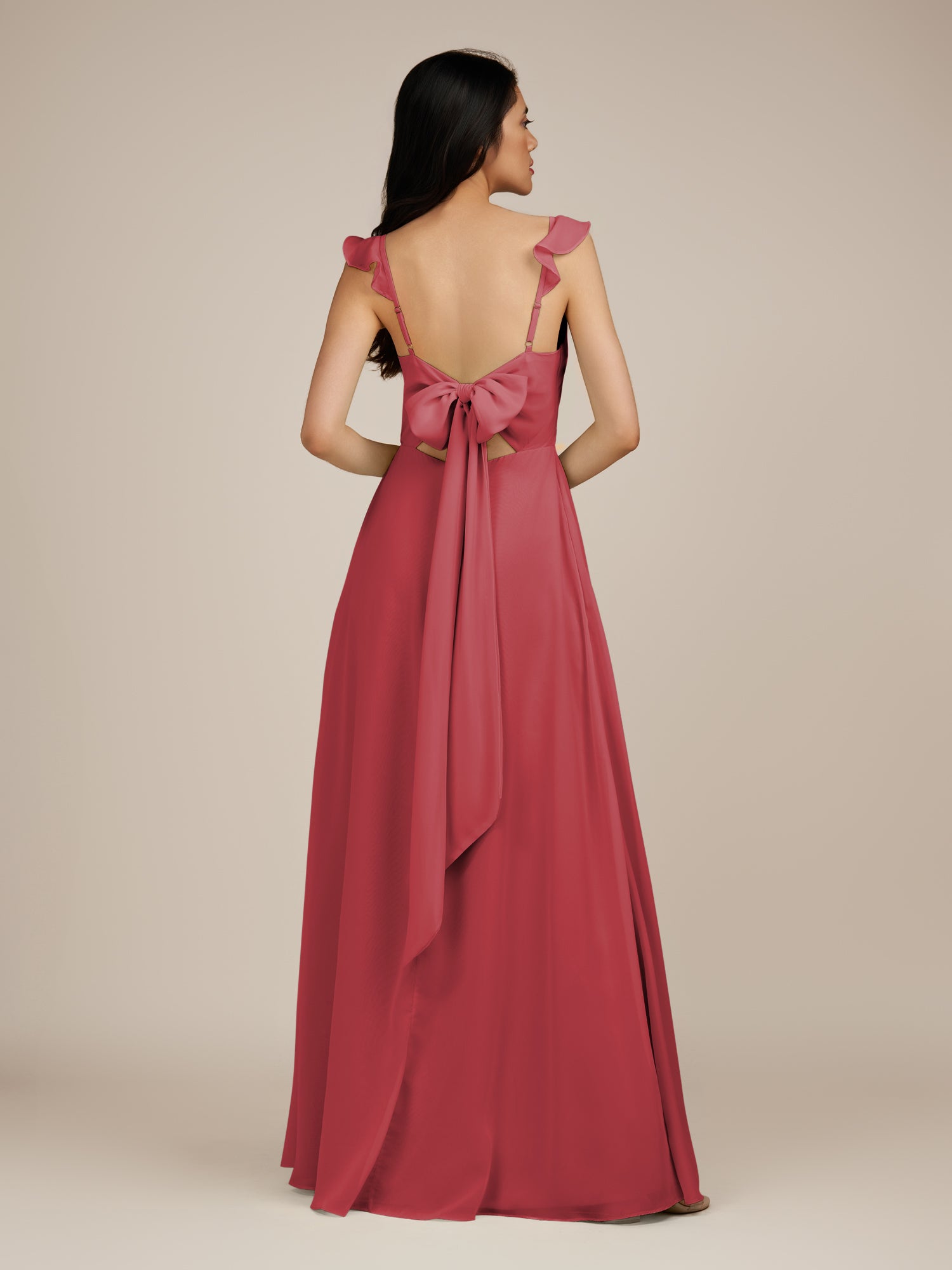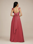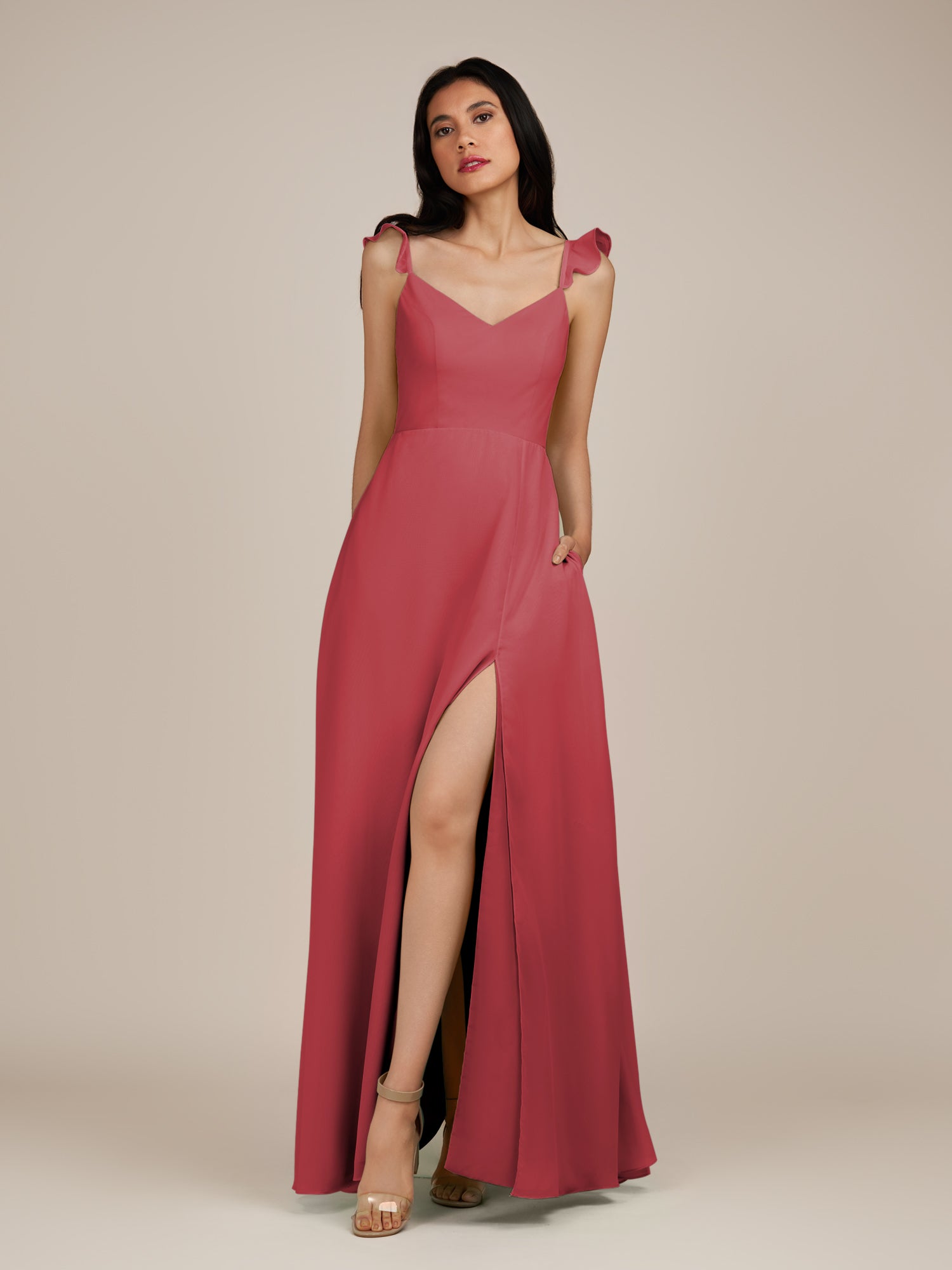 Citrine is a graceful and stylish choice for your bridal party. Crafted from soft chiffon, she features a flattering V-neckline and a sleeveless bodice for a modern, elegant look. Her floor-length A-line skirt flows beautifully with every step, accented by delicate ruffles and a subtle side slit for added movement and charm. Finished with a smooth zipper back, Citrine blends timeless sophistication with contemporary style, perfect for weddings and special occasions.