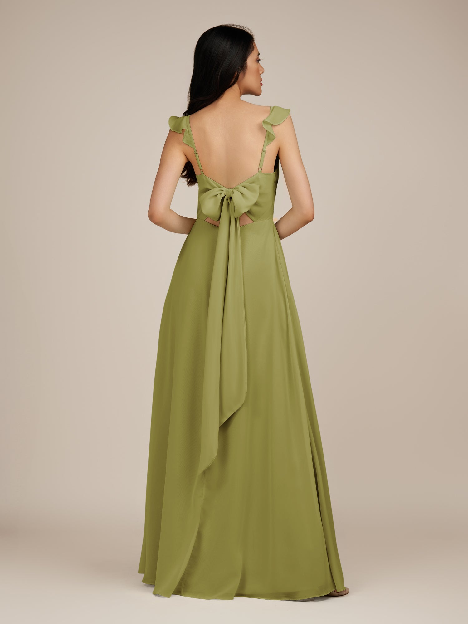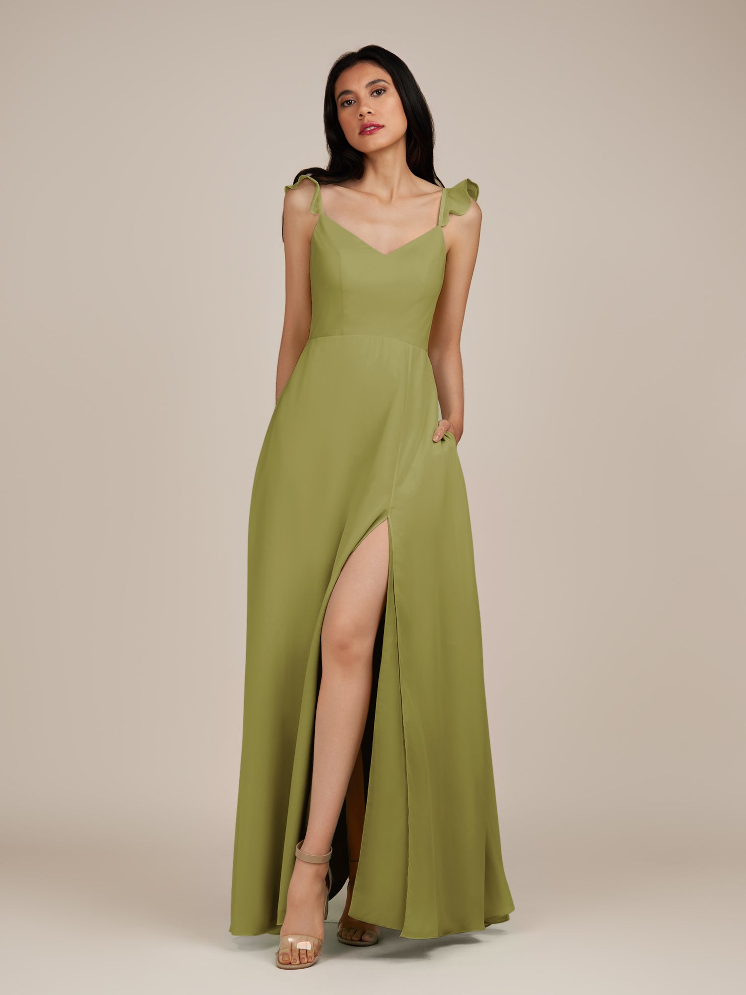 Citrine is a graceful and stylish choice for your bridal party. Crafted from soft chiffon, she features a flattering V-neckline and a sleeveless bodice for a modern, elegant look. Her floor-length A-line skirt flows beautifully with every step, accented by delicate ruffles and a subtle side slit for added movement and charm. Finished with a smooth zipper back, Citrine blends timeless sophistication with contemporary style, perfect for weddings and special occasions.
