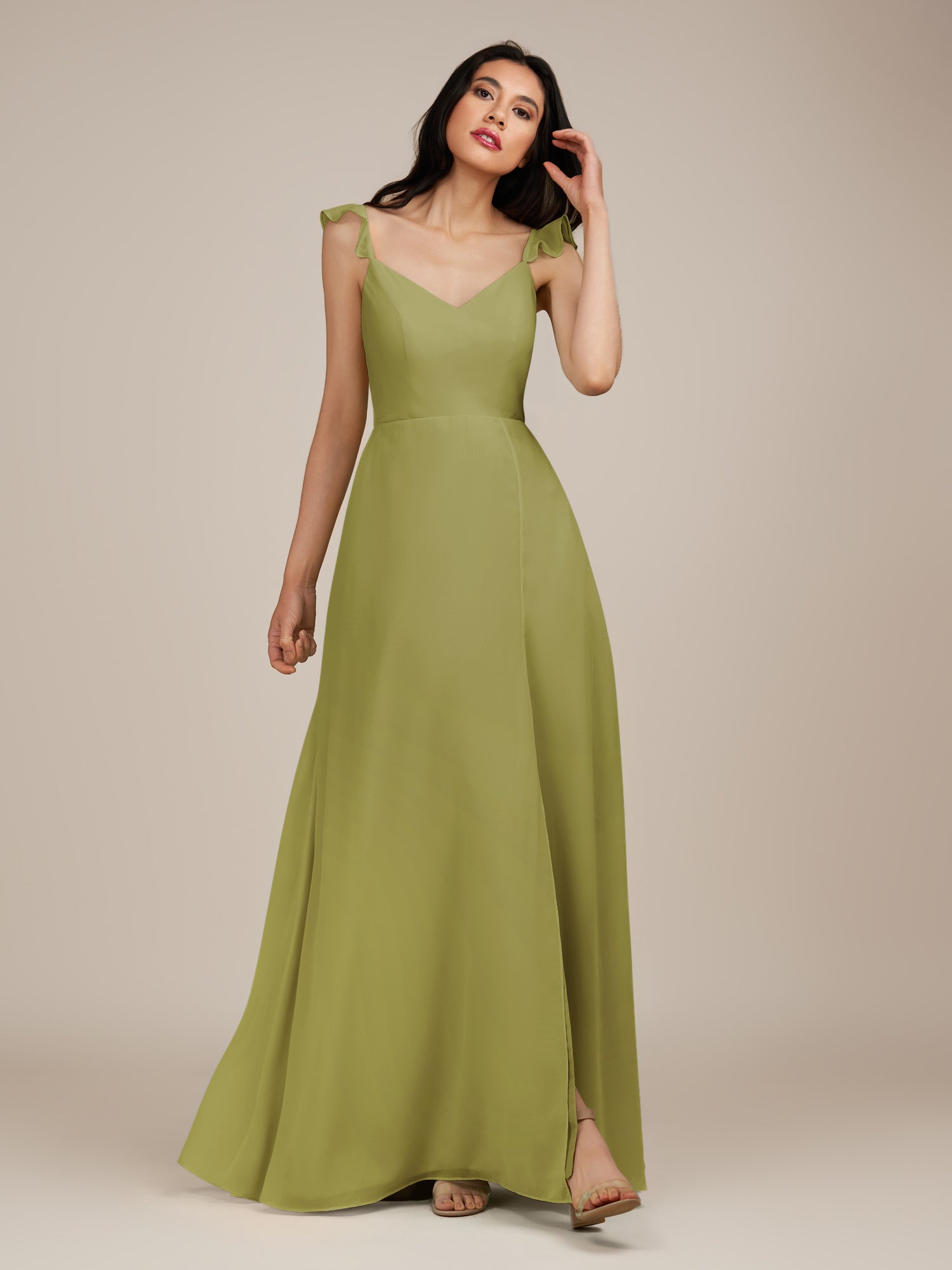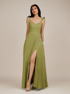 Citrine | Moss Green - A Line V Neck Chiffon Ruffled Long Bridesmaid Dress with Slit