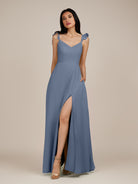 Citrine | Neptune - A Line V Neck Chiffon Ruffled Long Bridesmaid Dress with Slit