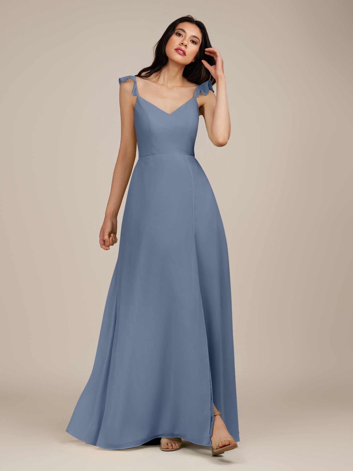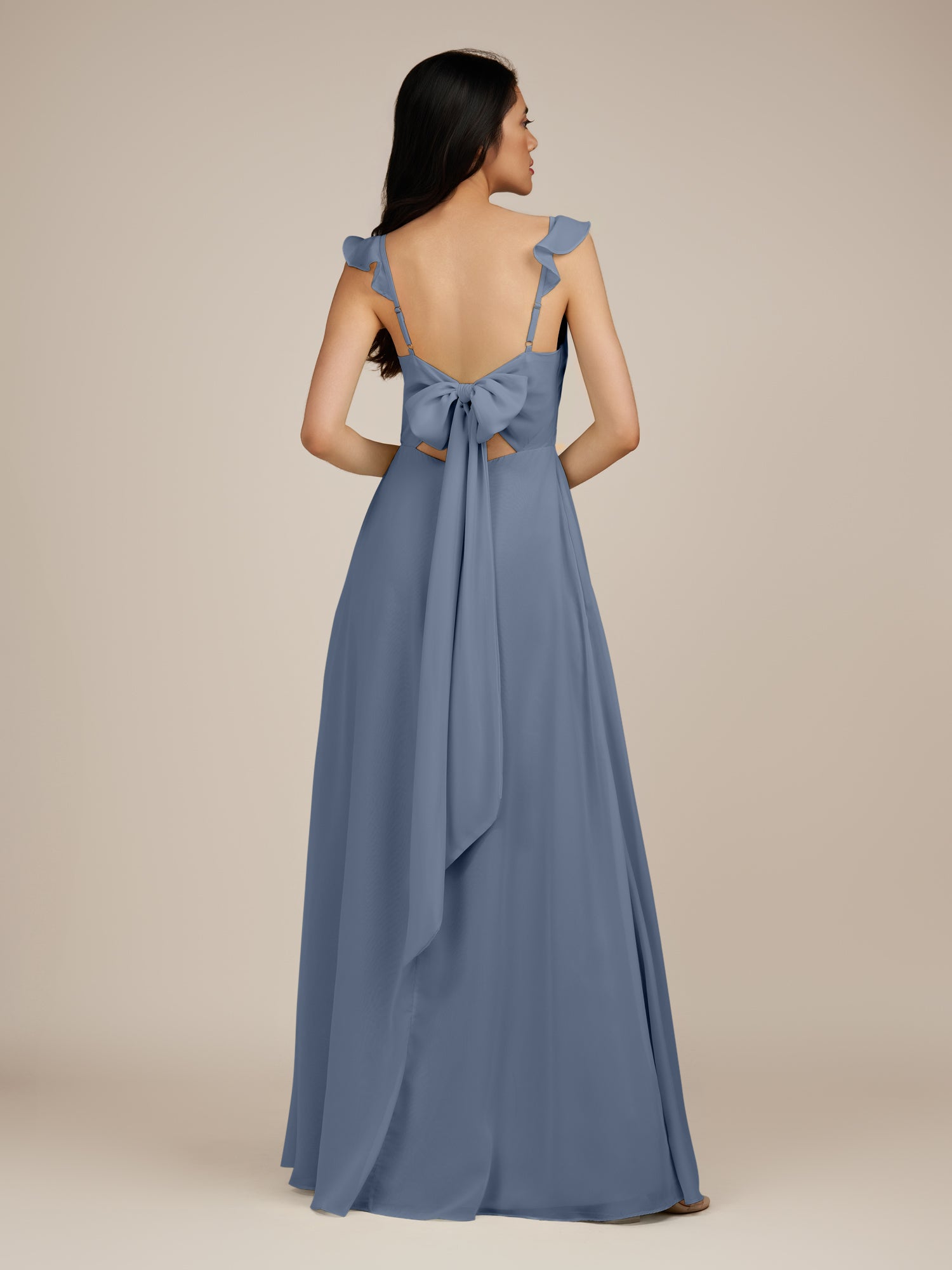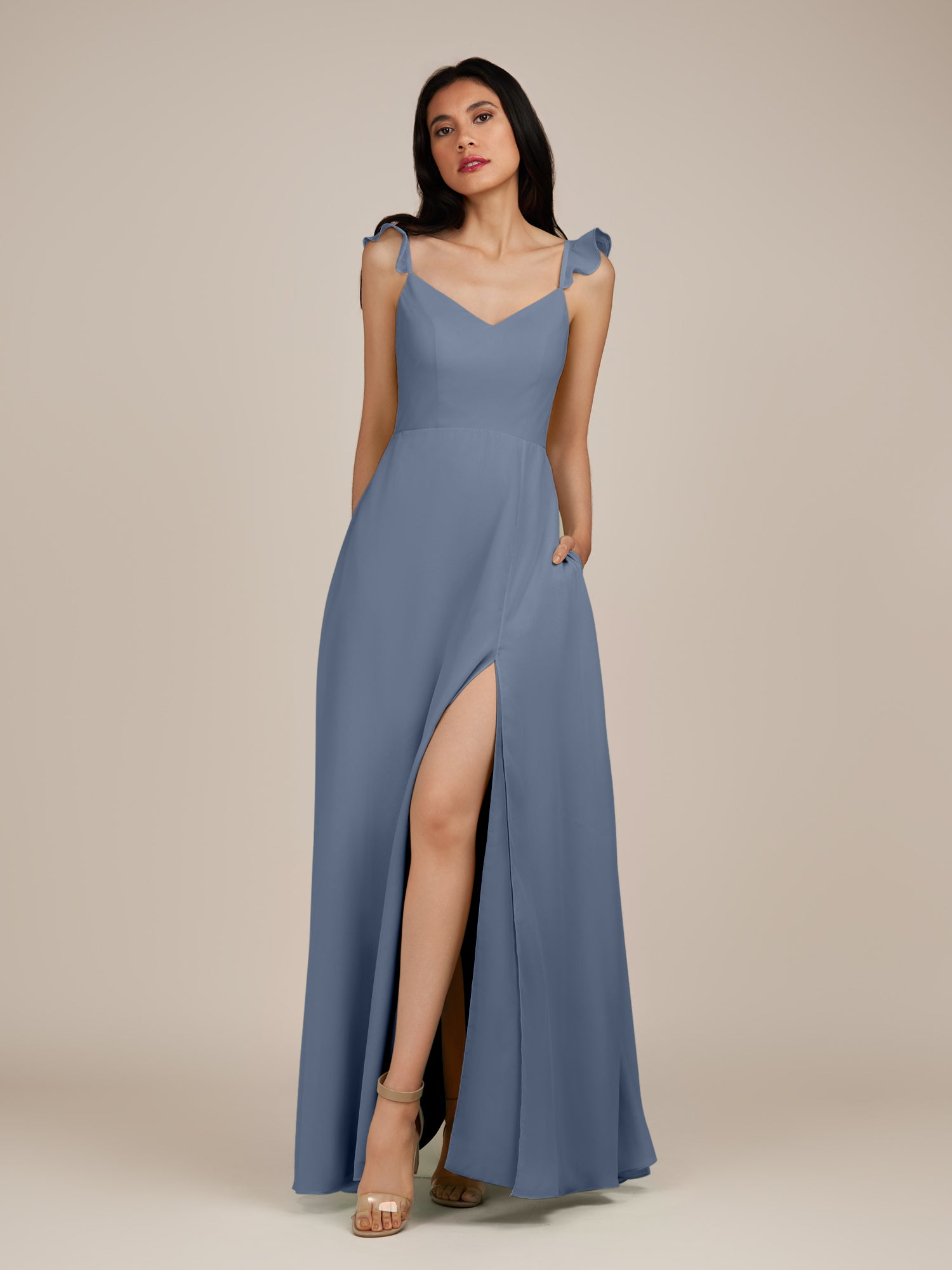 Citrine is a graceful and stylish choice for your bridal party. Crafted from soft chiffon, she features a flattering V-neckline and a sleeveless bodice for a modern, elegant look. Her floor-length A-line skirt flows beautifully with every step, accented by delicate ruffles and a subtle side slit for added movement and charm. Finished with a smooth zipper back, Citrine blends timeless sophistication with contemporary style, perfect for weddings and special occasions.