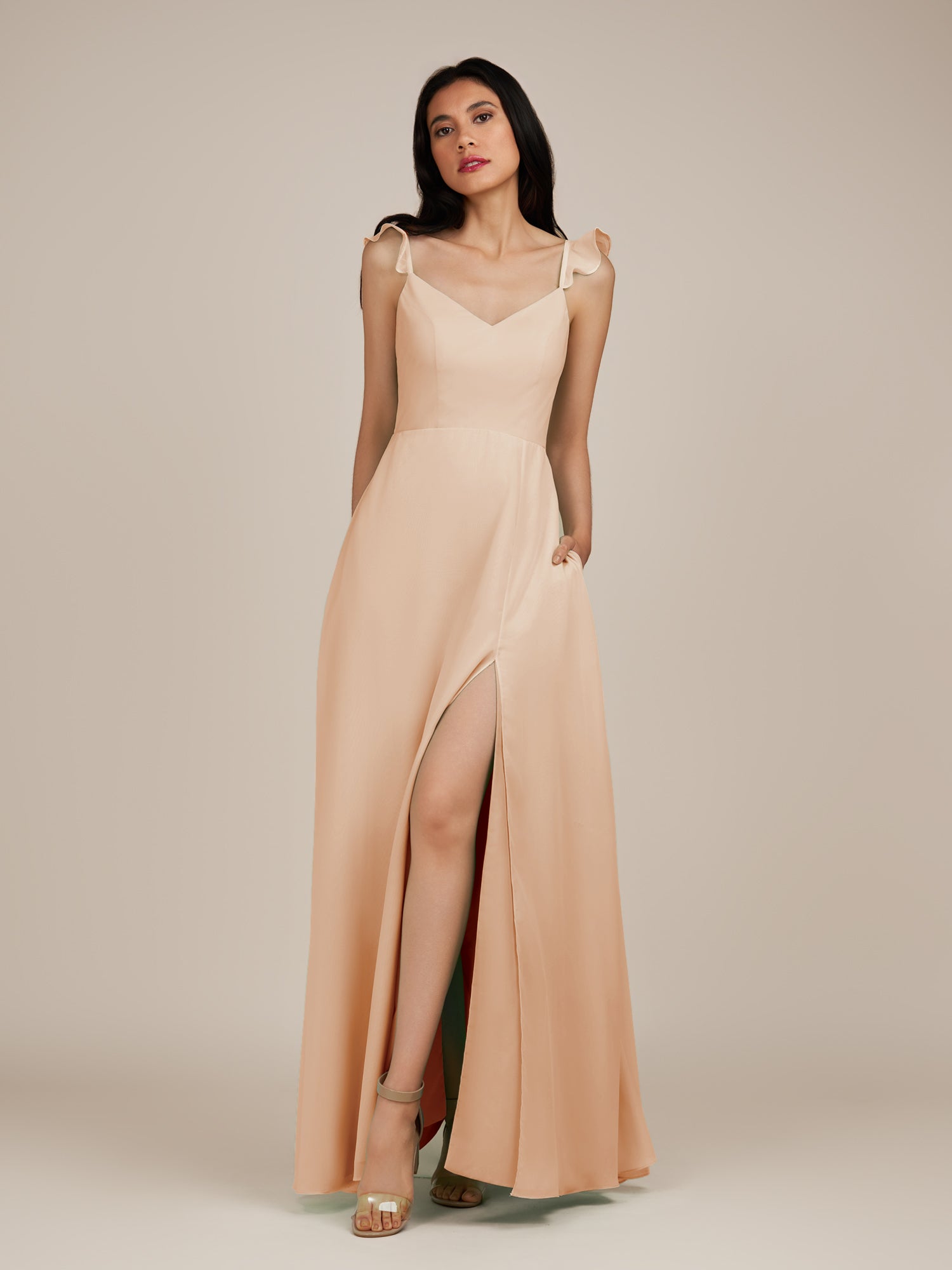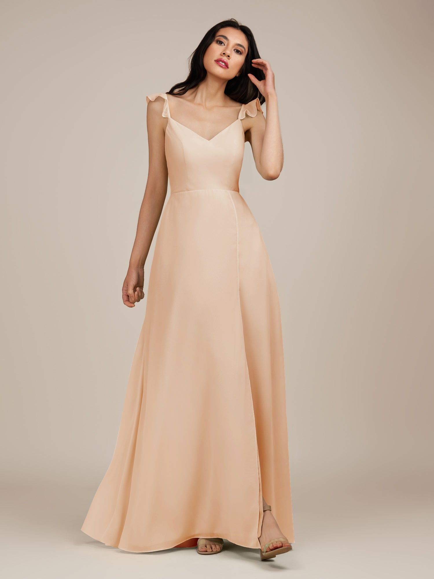 Citrine is a graceful and stylish choice for your bridal party. Crafted from soft chiffon, she features a flattering V-neckline and a sleeveless bodice for a modern, elegant look. Her floor-length A-line skirt flows beautifully with every step, accented by delicate ruffles and a subtle side slit for added movement and charm. Finished with a smooth zipper back, Citrine blends timeless sophistication with contemporary style, perfect for weddings and special occasions.