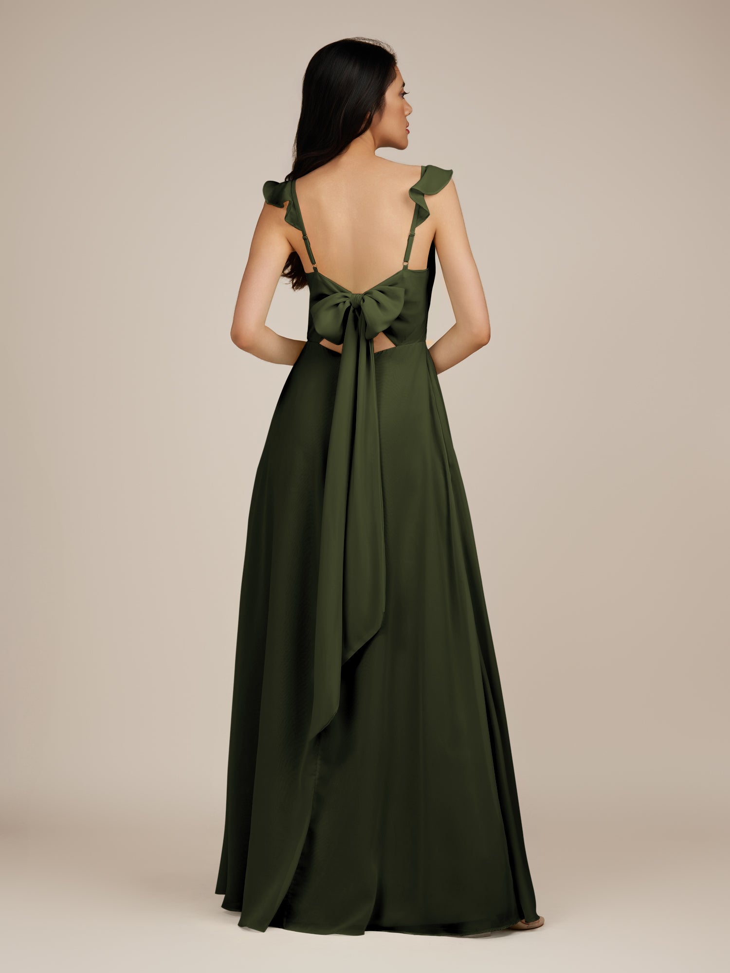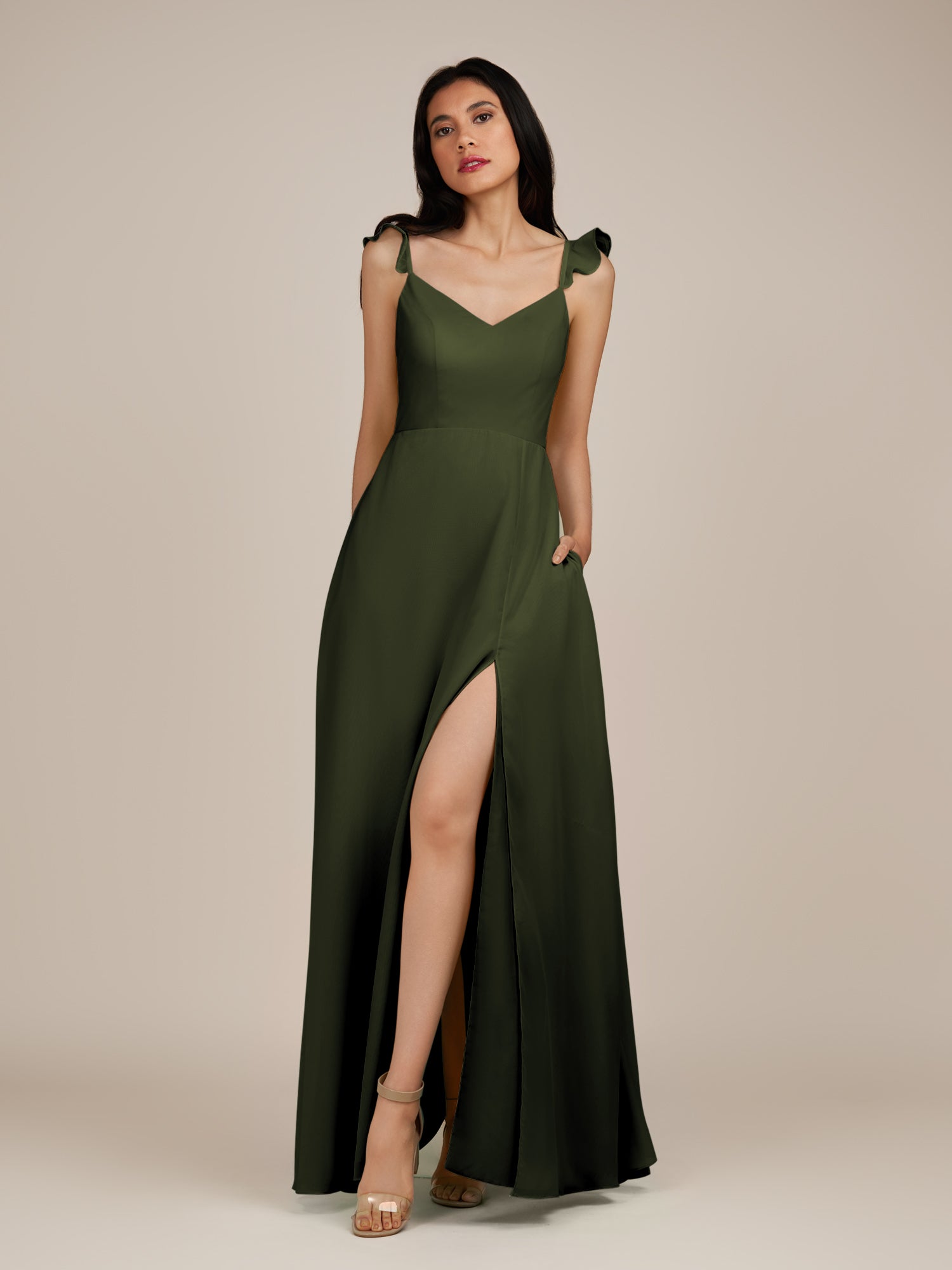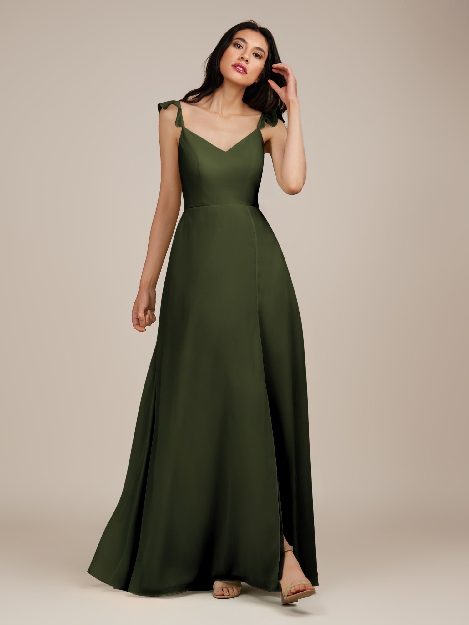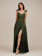 Citrine | Olive - A Line V Neck Chiffon Ruffled Long Bridesmaid Dress with Slit