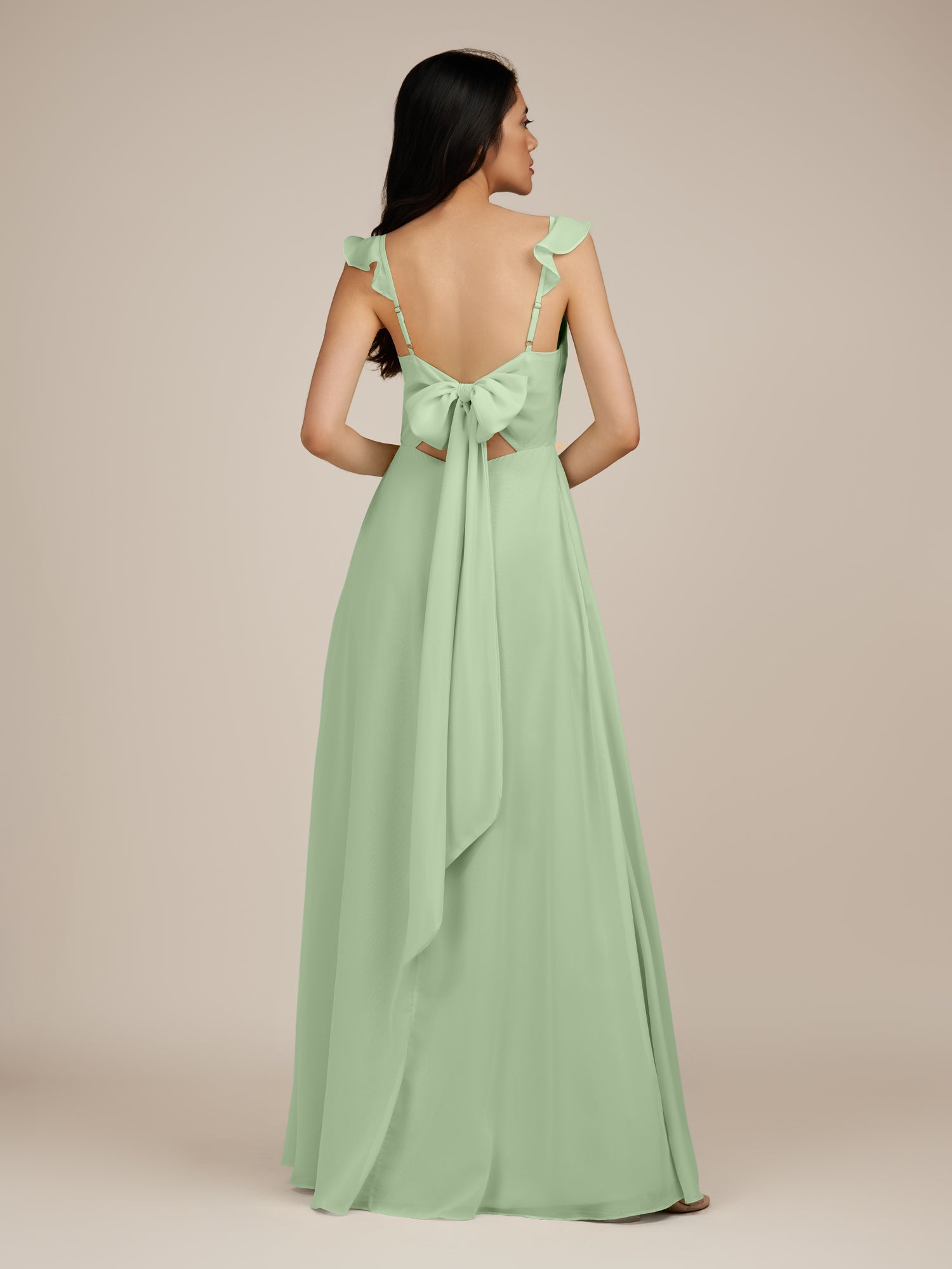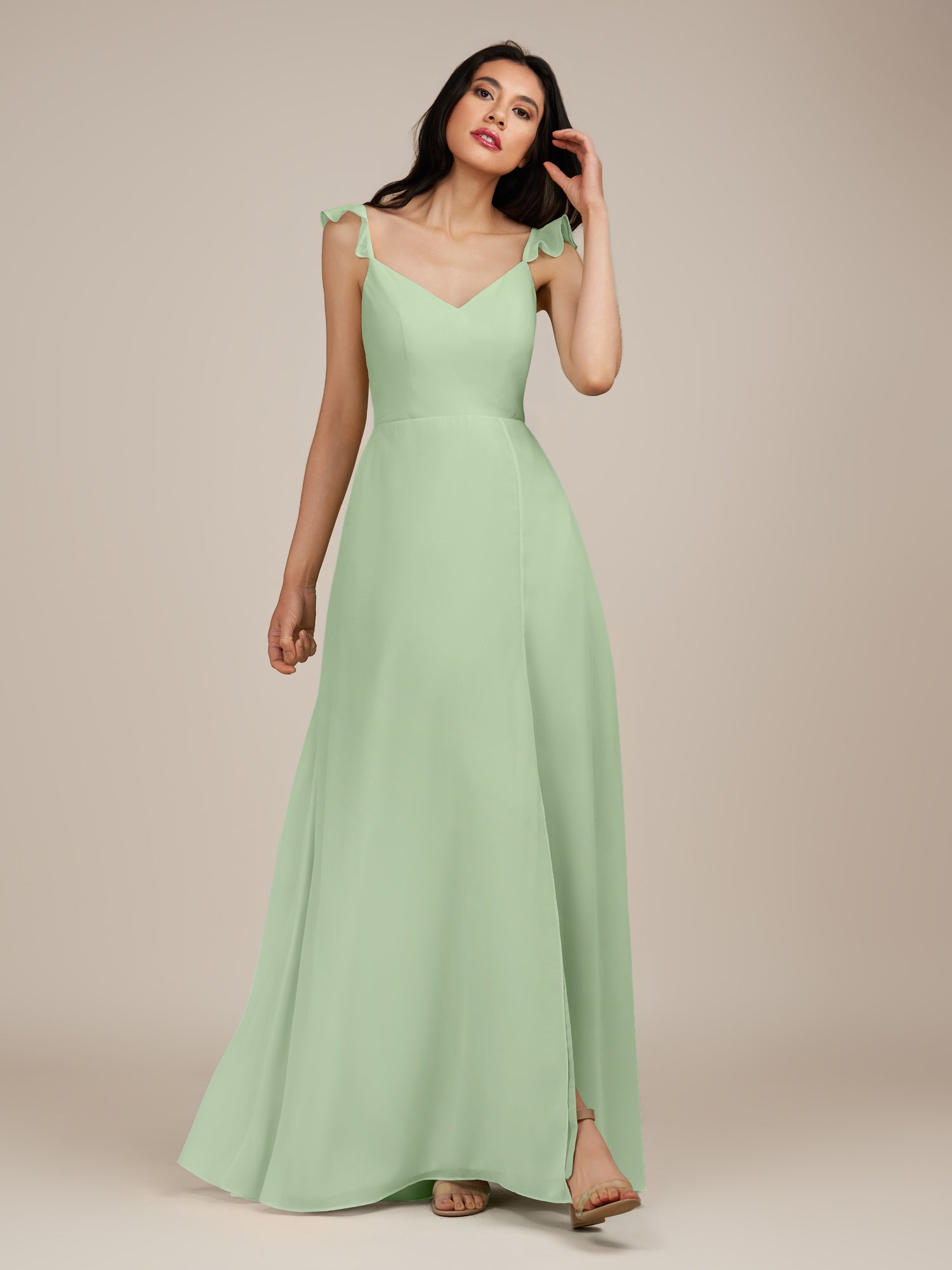 Citrine | Sage - A Line V Neck Chiffon Ruffled Long Bridesmaid Dress with Slit