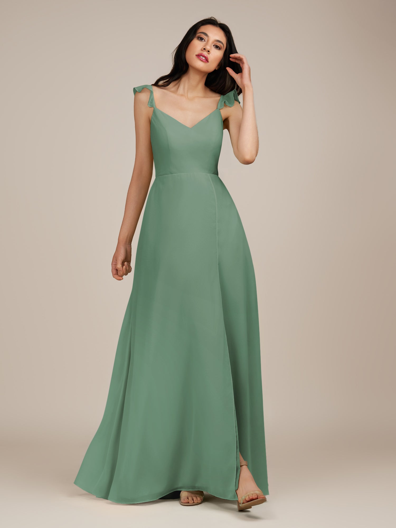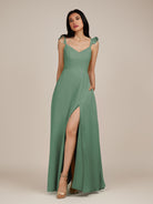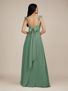 Citrine | Sea Glass - A Line V Neck Chiffon Ruffled Long Bridesmaid Dress with Slit