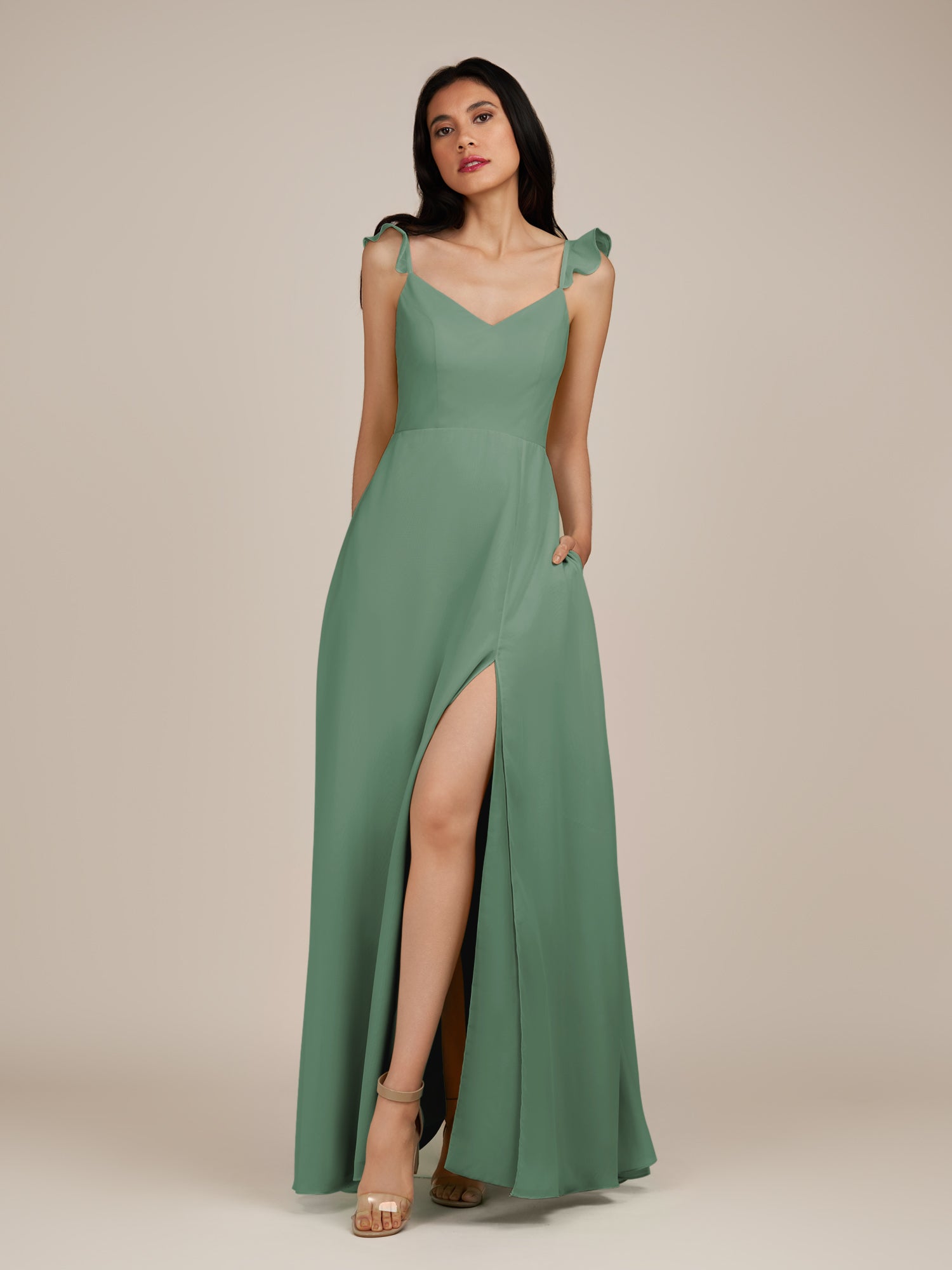 Citrine is a graceful and stylish choice for your bridal party. Crafted from soft chiffon, she features a flattering V-neckline and a sleeveless bodice for a modern, elegant look. Her floor-length A-line skirt flows beautifully with every step, accented by delicate ruffles and a subtle side slit for added movement and charm. Finished with a smooth zipper back, Citrine blends timeless sophistication with contemporary style, perfect for weddings and special occasions.