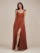 Citrine | Spice - A Line V Neck Chiffon Ruffled Long Bridesmaid Dress with Slit