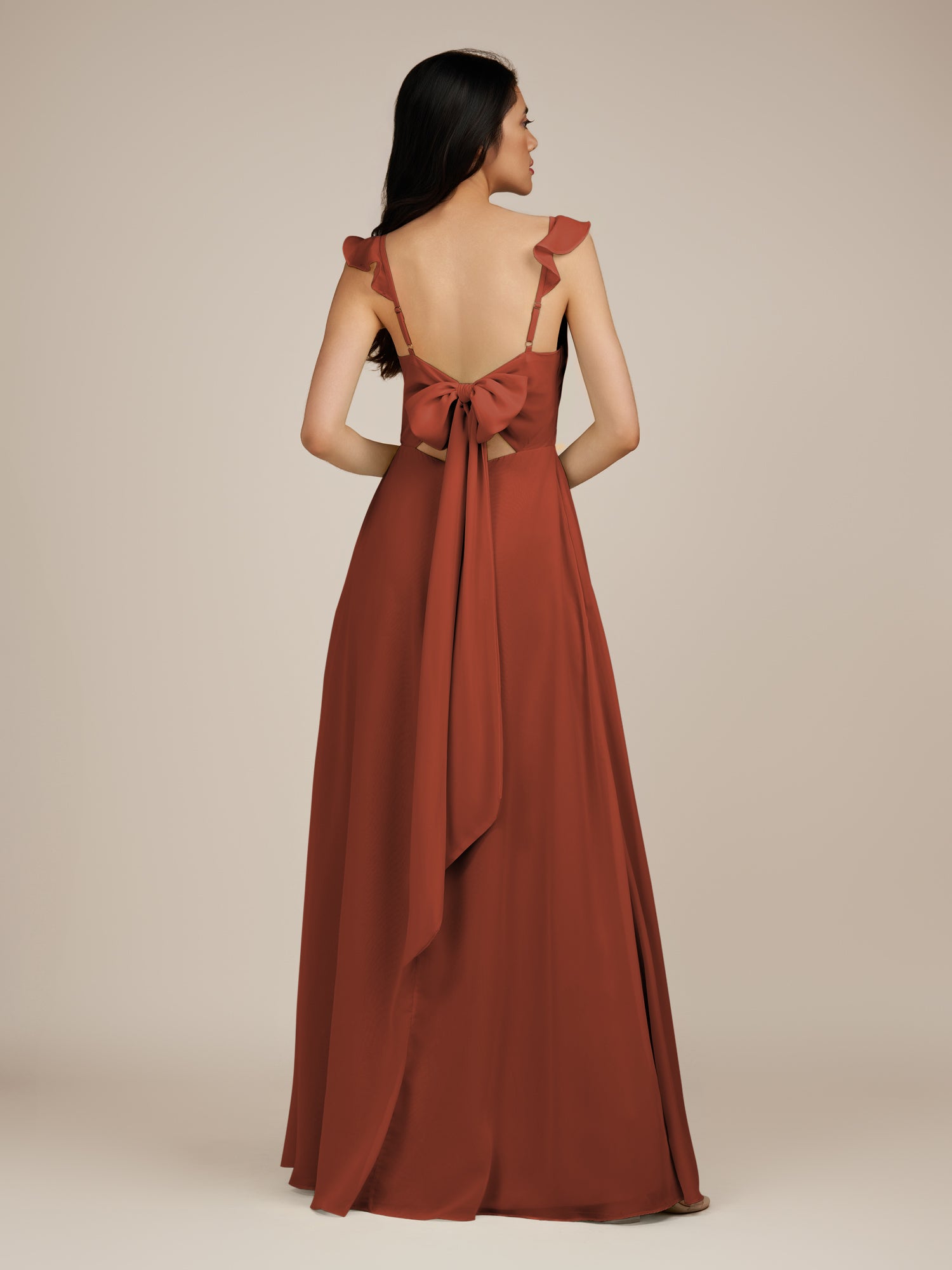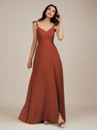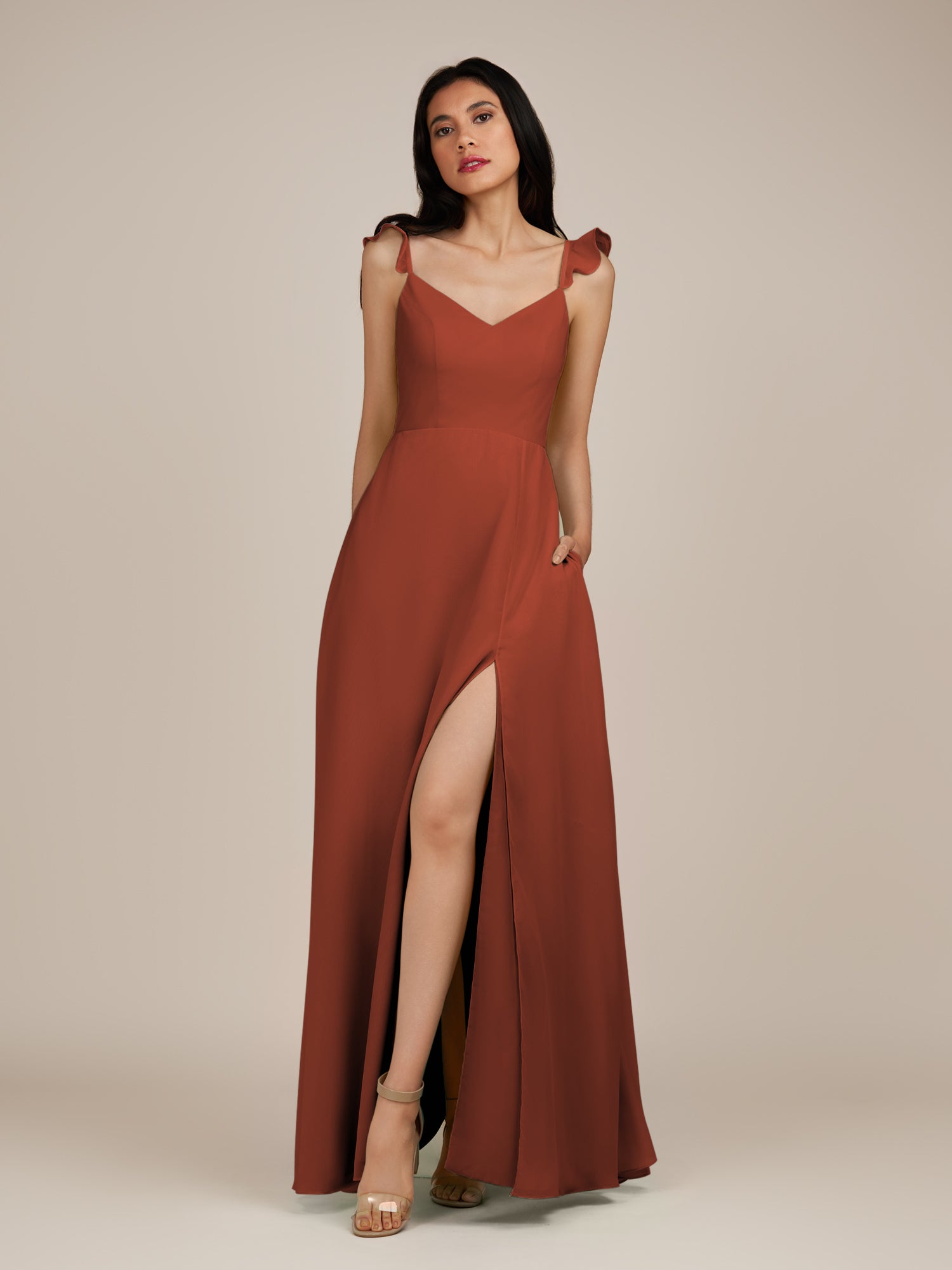 Citrine is a graceful and stylish choice for your bridal party. Crafted from soft chiffon, she features a flattering V-neckline and a sleeveless bodice for a modern, elegant look. Her floor-length A-line skirt flows beautifully with every step, accented by delicate ruffles and a subtle side slit for added movement and charm. Finished with a smooth zipper back, Citrine blends timeless sophistication with contemporary style, perfect for weddings and special occasions.