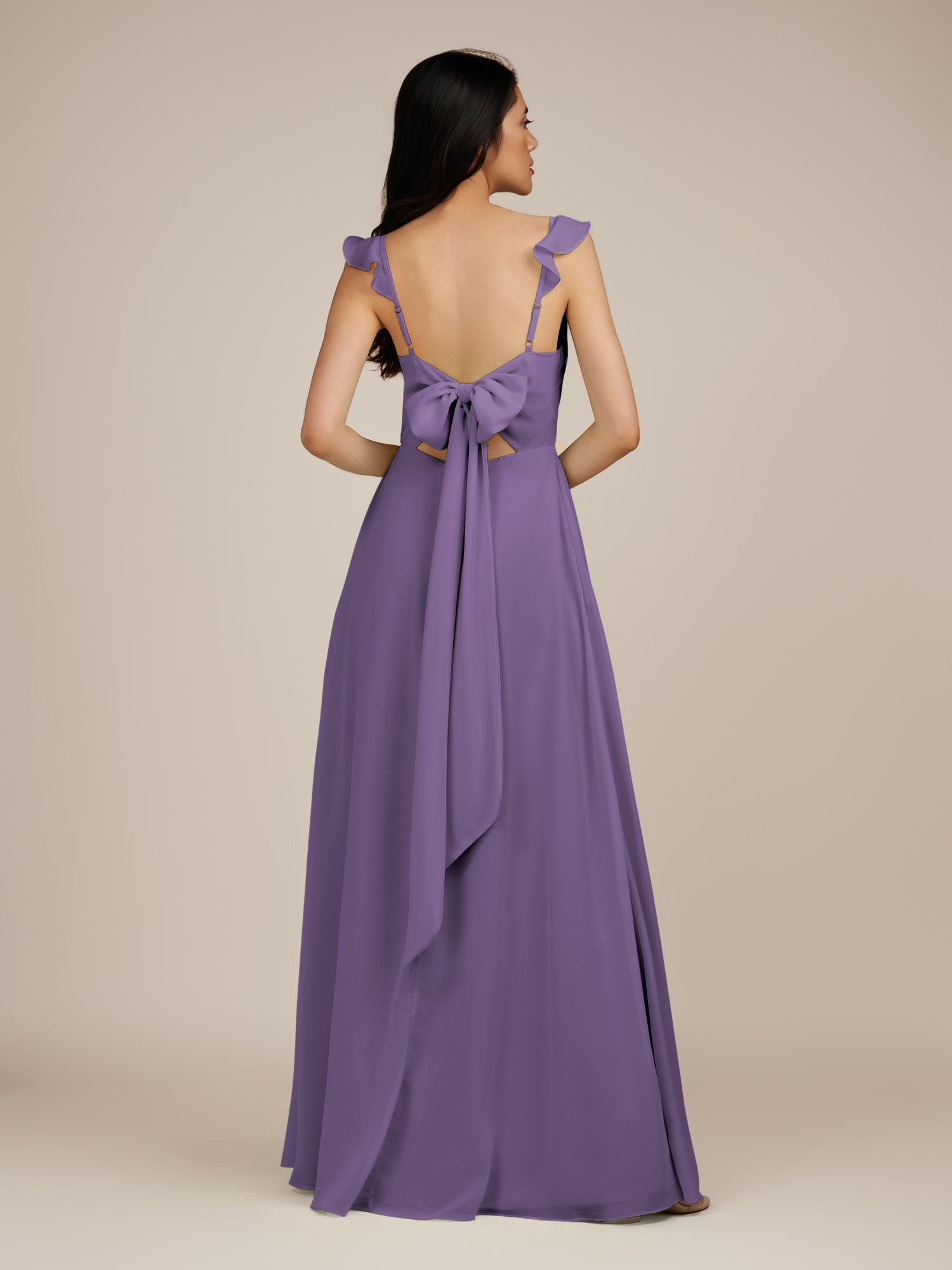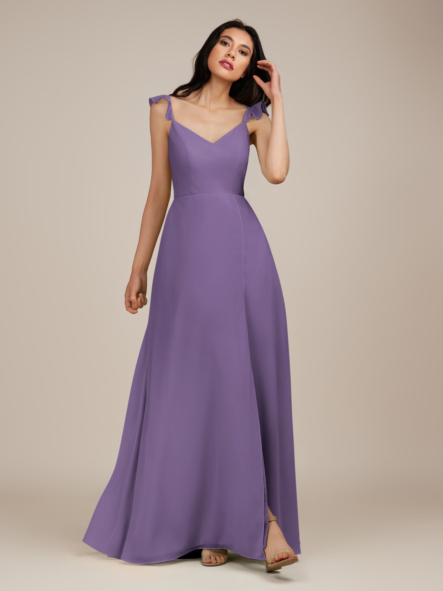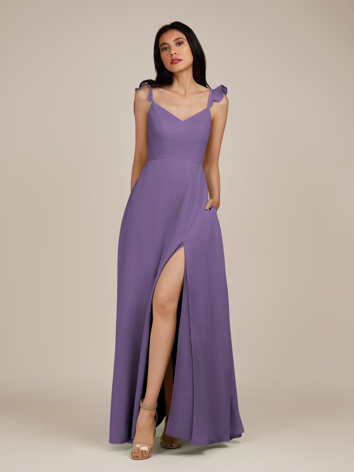 Citrine is a graceful and stylish choice for your bridal party. Crafted from soft chiffon, she features a flattering V-neckline and a sleeveless bodice for a modern, elegant look. Her floor-length A-line skirt flows beautifully with every step, accented by delicate ruffles and a subtle side slit for added movement and charm. Finished with a smooth zipper back, Citrine blends timeless sophistication with contemporary style, perfect for weddings and special occasions.