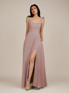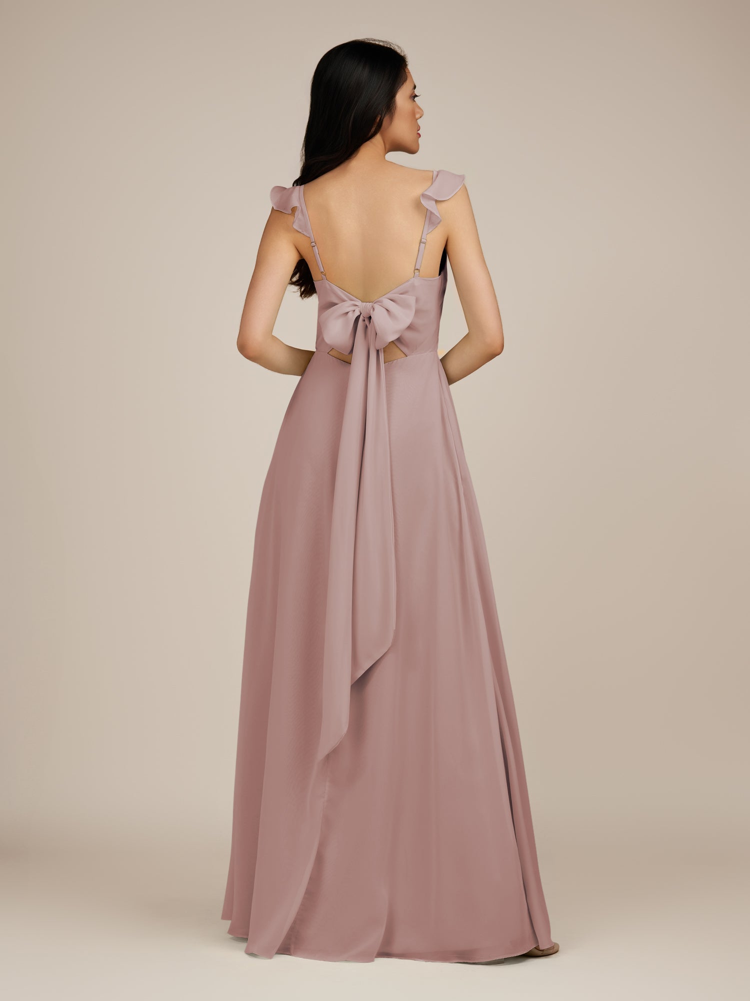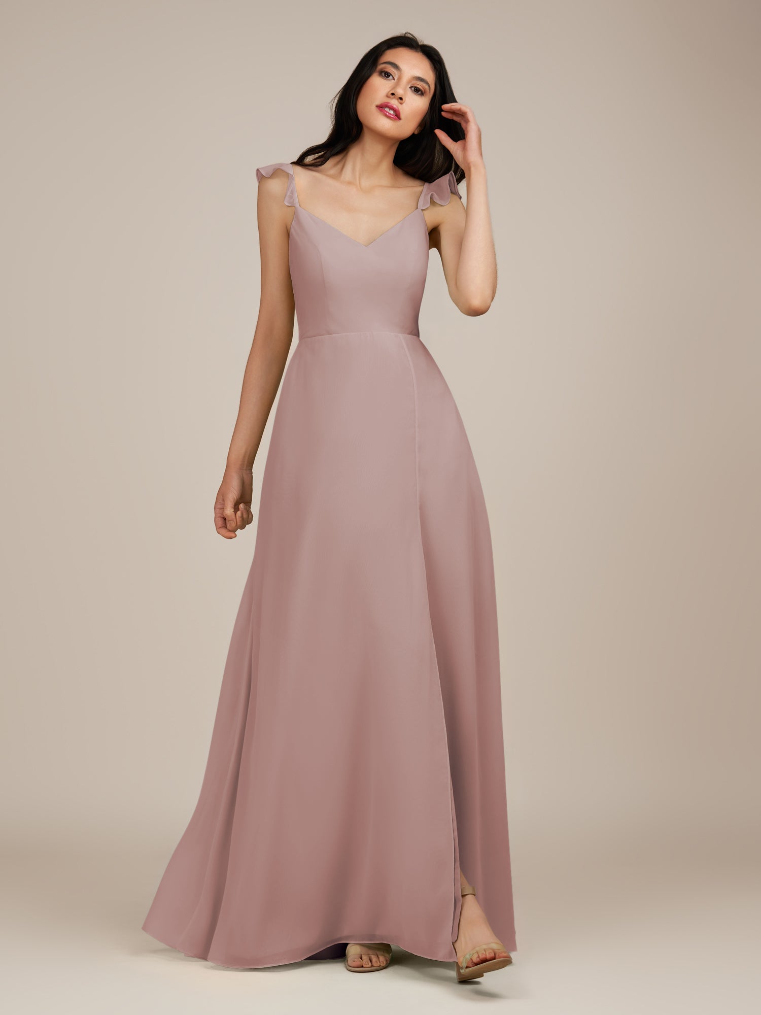 Citrine is a graceful and stylish choice for your bridal party. Crafted from soft chiffon, she features a flattering V-neckline and a sleeveless bodice for a modern, elegant look. Her floor-length A-line skirt flows beautifully with every step, accented by delicate ruffles and a subtle side slit for added movement and charm. Finished with a smooth zipper back, Citrine blends timeless sophistication with contemporary style, perfect for weddings and special occasions.