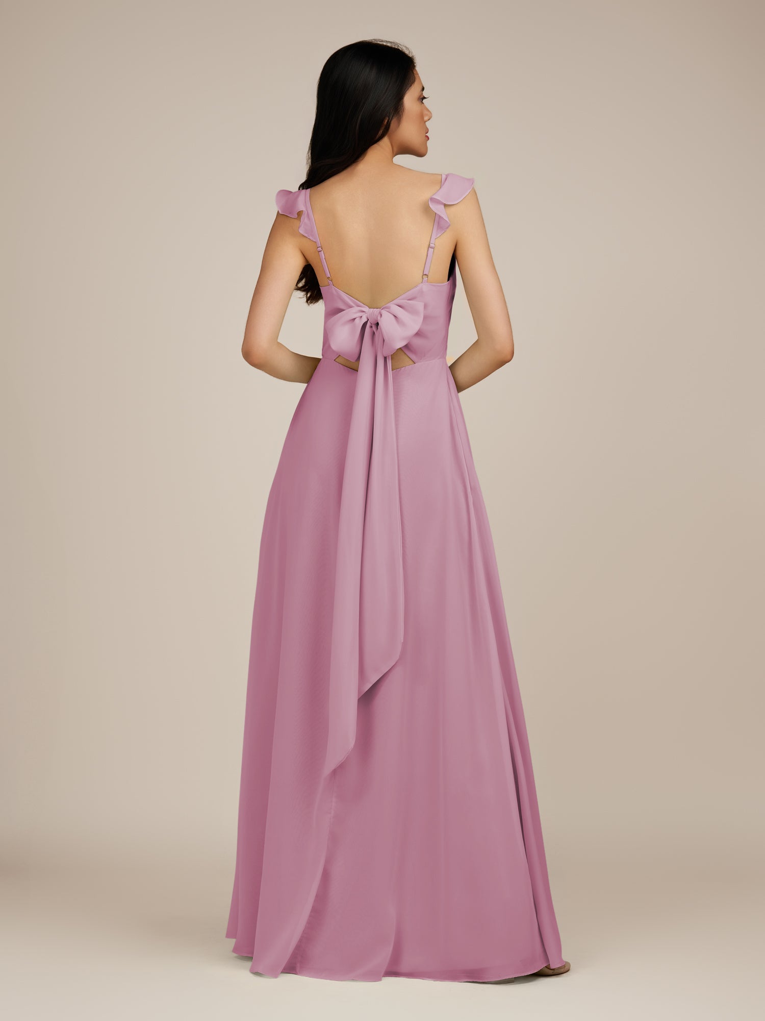 Citrine is a graceful and stylish choice for your bridal party. Crafted from soft chiffon, she features a flattering V-neckline and a sleeveless bodice for a modern, elegant look. Her floor-length A-line skirt flows beautifully with every step, accented by delicate ruffles and a subtle side slit for added movement and charm. Finished with a smooth zipper back, Citrine blends timeless sophistication with contemporary style, perfect for weddings and special occasions.