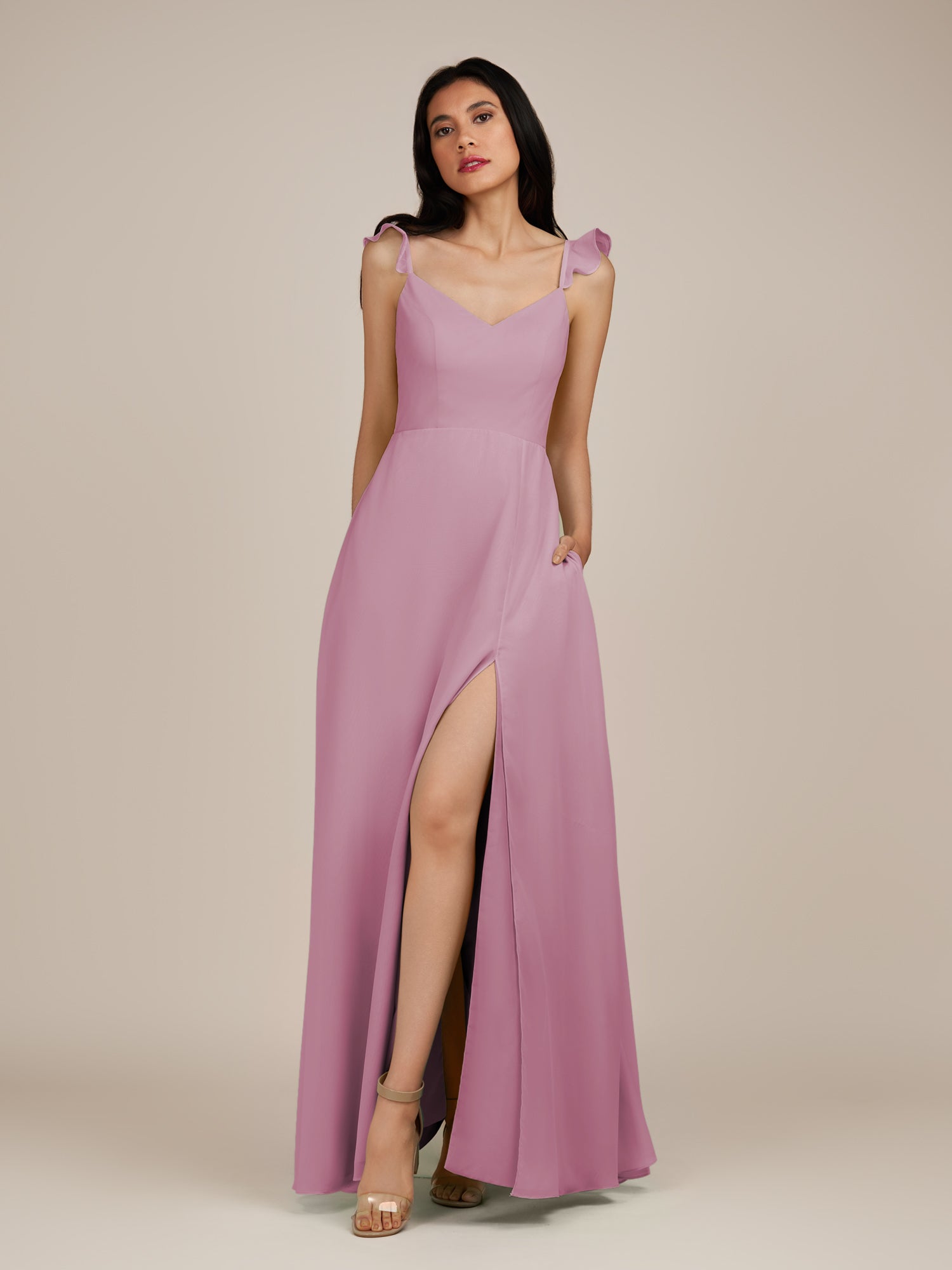 Citrine | Vintage Mauve - A Line V Neck Chiffon Ruffled Long Bridesmaid Dress with Slit
