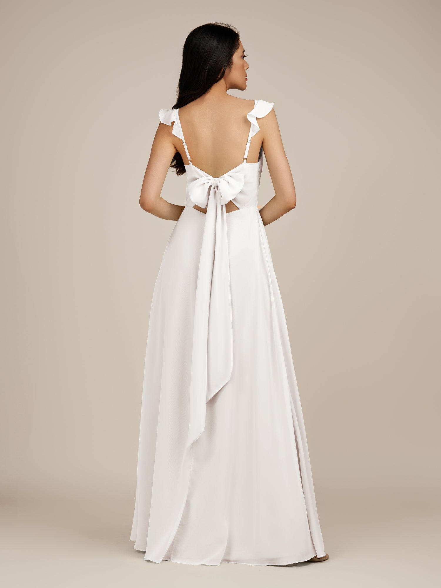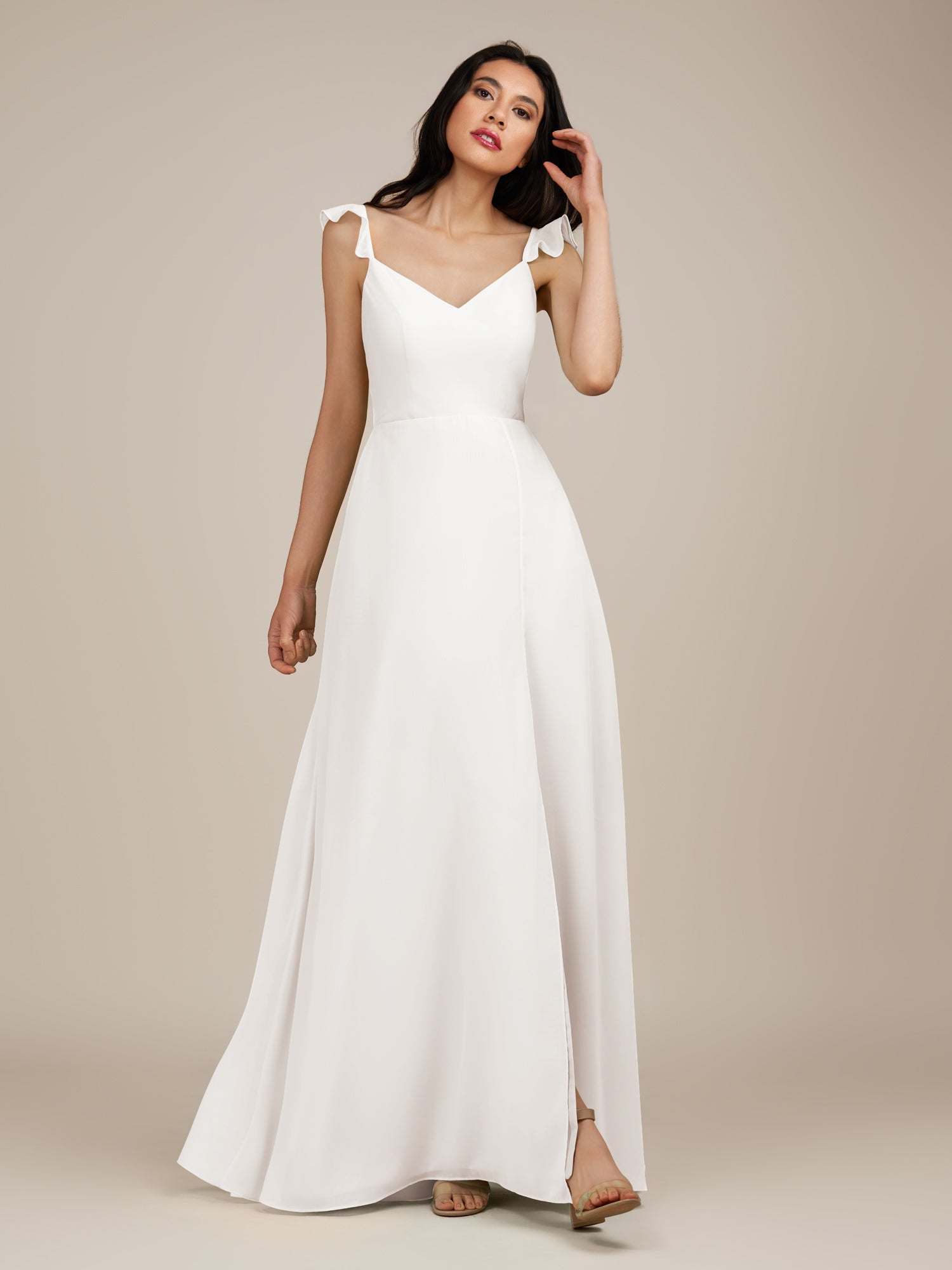 Citrine is a graceful and stylish choice for your bridal party. Crafted from soft chiffon, she features a flattering V-neckline and a sleeveless bodice for a modern, elegant look. Her floor-length A-line skirt flows beautifully with every step, accented by delicate ruffles and a subtle side slit for added movement and charm. Finished with a smooth zipper back, Citrine blends timeless sophistication with contemporary style, perfect for weddings and special occasions.