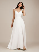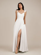 Citrine | White - A Line V Neck Chiffon Ruffled Long Bridesmaid Dress with Slit