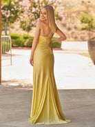 Step into the spotlight with the Charming Mermaid Strapless Yellow Satin Long Prom Dress. This stunning dress showcases a sleek sheath silhouette that hugs your body in all the right places. It is crafted from luxurious satin, the vibrant yellow color radiates warmth and positivity, ensuring you stand out at any event. The flattering strapless neckline highlights your collarbone and shoulders, adding a touch of romance to the design. This dress is a perfect choice for both evening dresses and formal dresses, with its daring split adds an element of intrigue, allowing for effortless movement and a hint of allure. The convenient zipper back ensures a secure fit, so you can dance the night away with confidence.Embrace the magic of the night in this captivating piece!