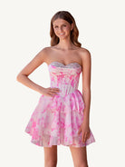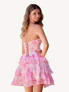 Evolet | Pink - A Line Sweetheart Floral Chiffon Ruffles Homecoming Dress With Beading