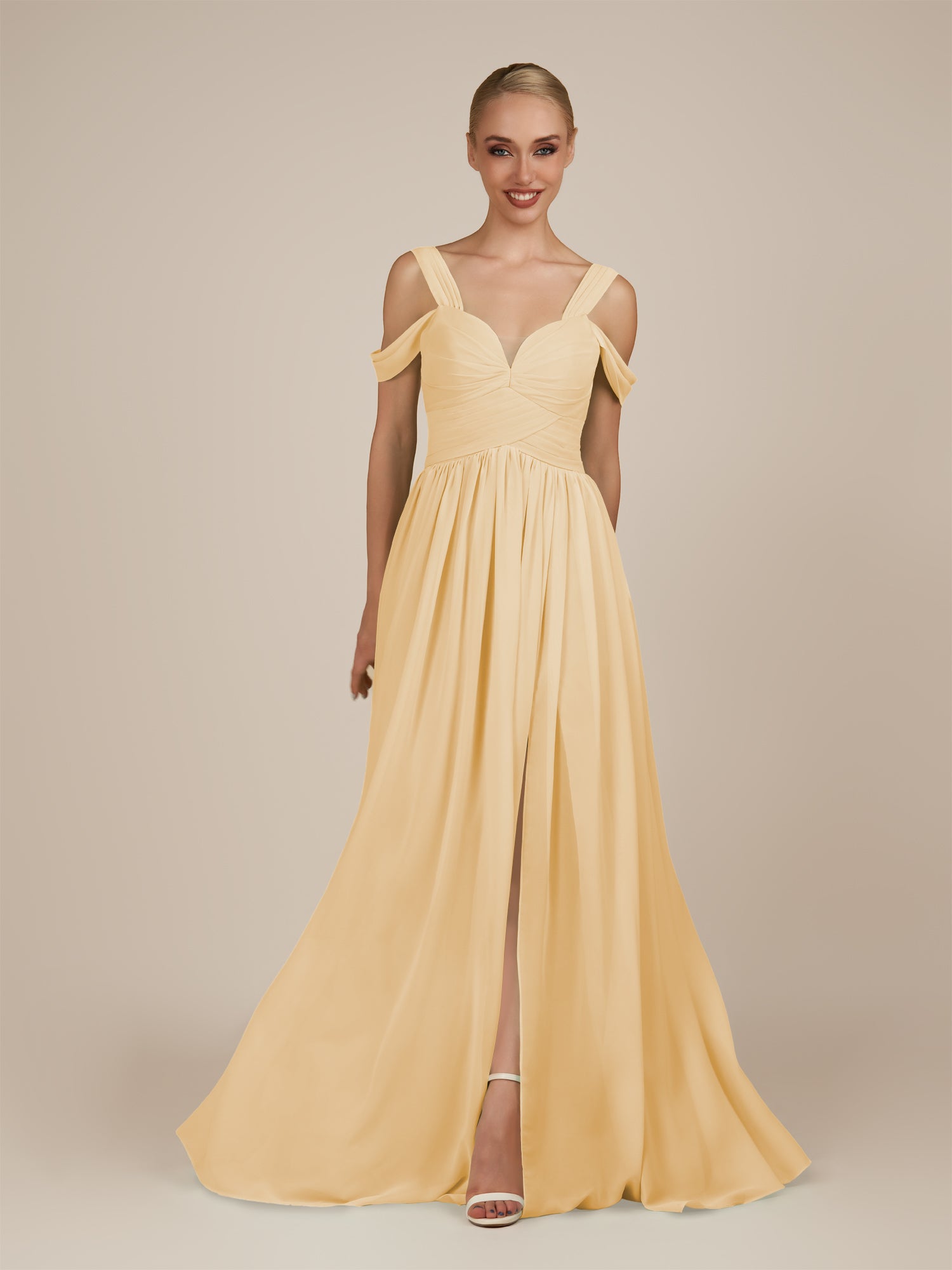 Faye | A Line Chiffon Off the Shoulder Pleated Long Bridesmaid Dress with Slit