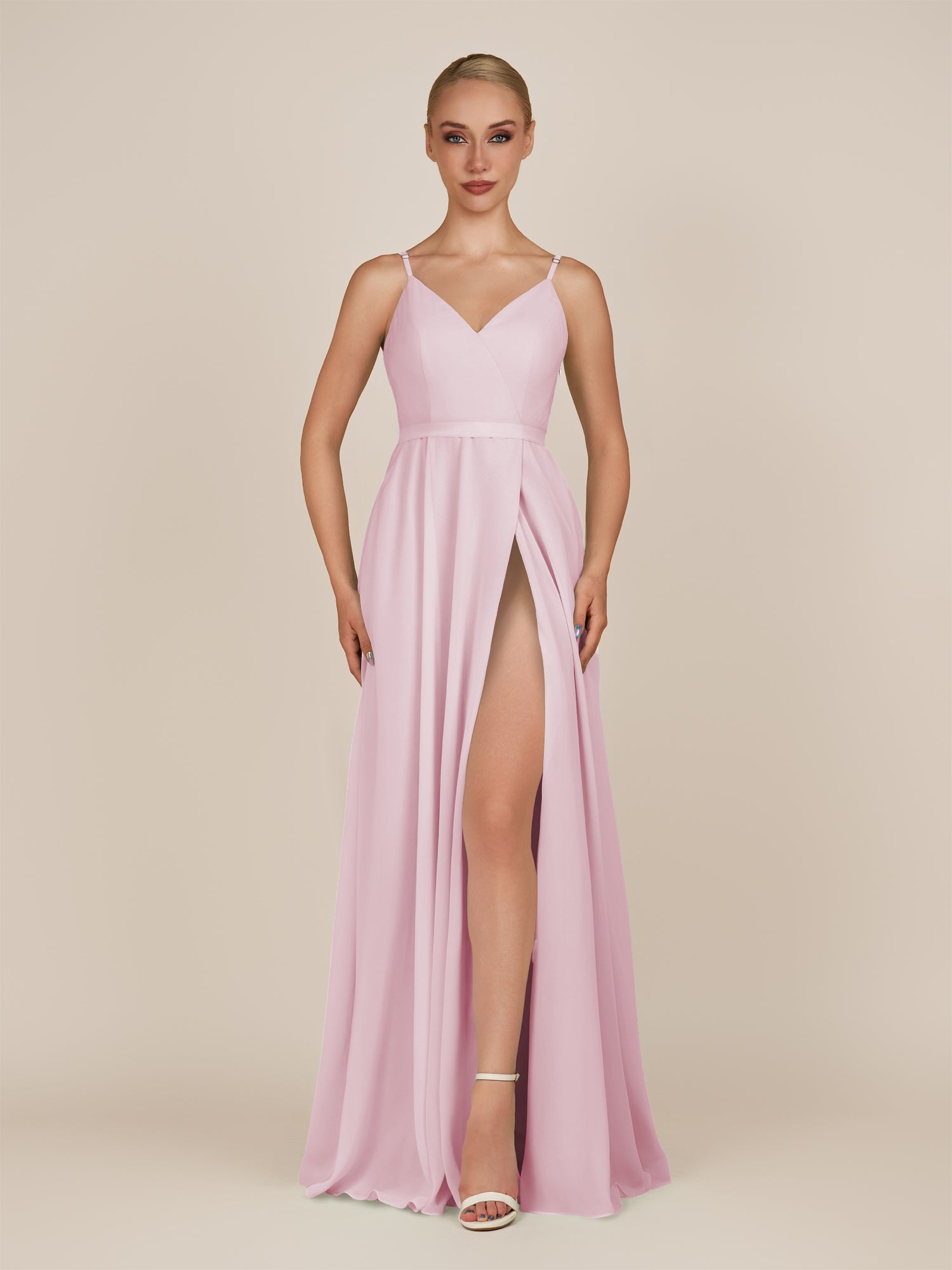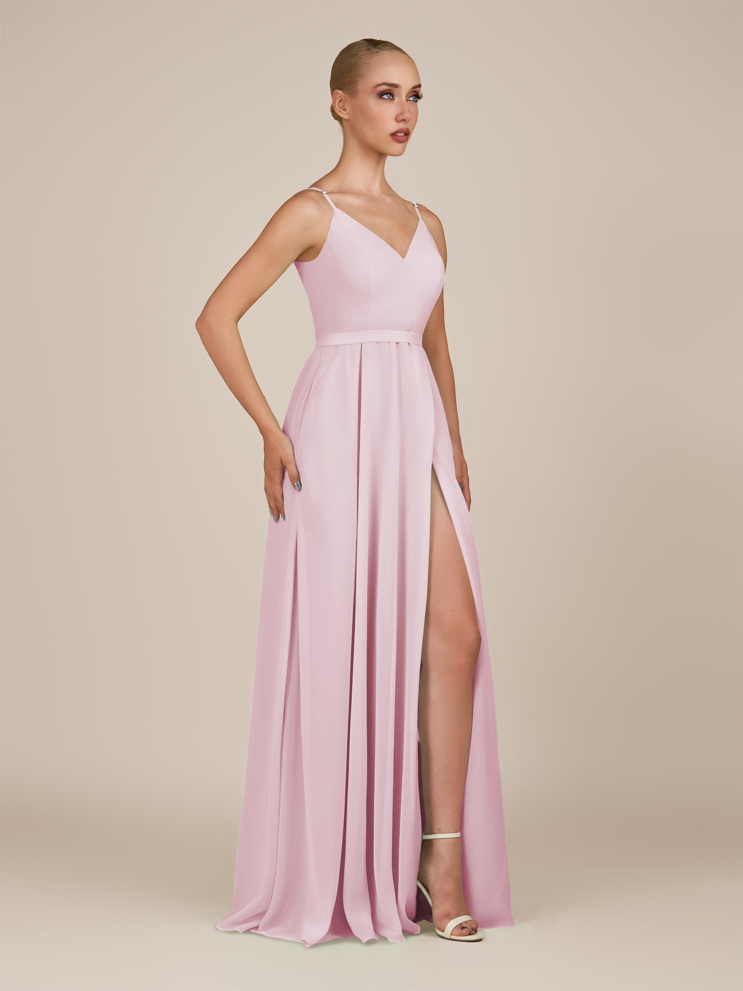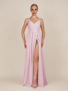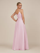 Glenys is a timeless and elegant choice for your bridal party. Crafted from soft chiffon, she features a flattering V neckline and a sleeveless bodice that highlights the shoulders. Her flowing floor-length A-line skirt moves gracefully with every step, complemented by a subtle leg slit for modern sophistication. Finished with a smooth zipper back, Glenys combines effortless style and comfort for weddings and special occasions.