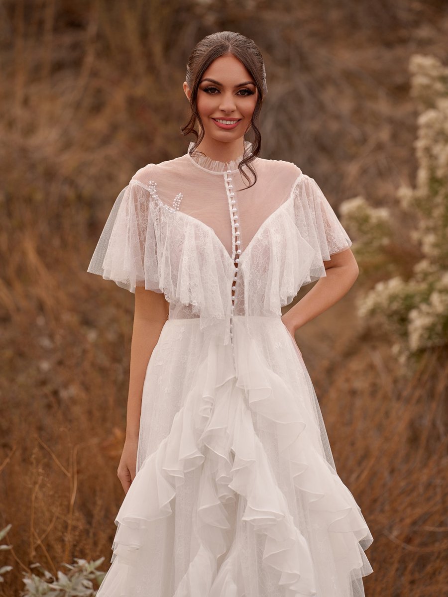High Split A-Line See-through Short Sleeves Ruffle Tulle Wedding Dresses