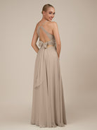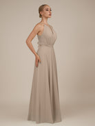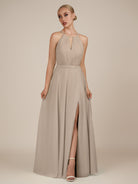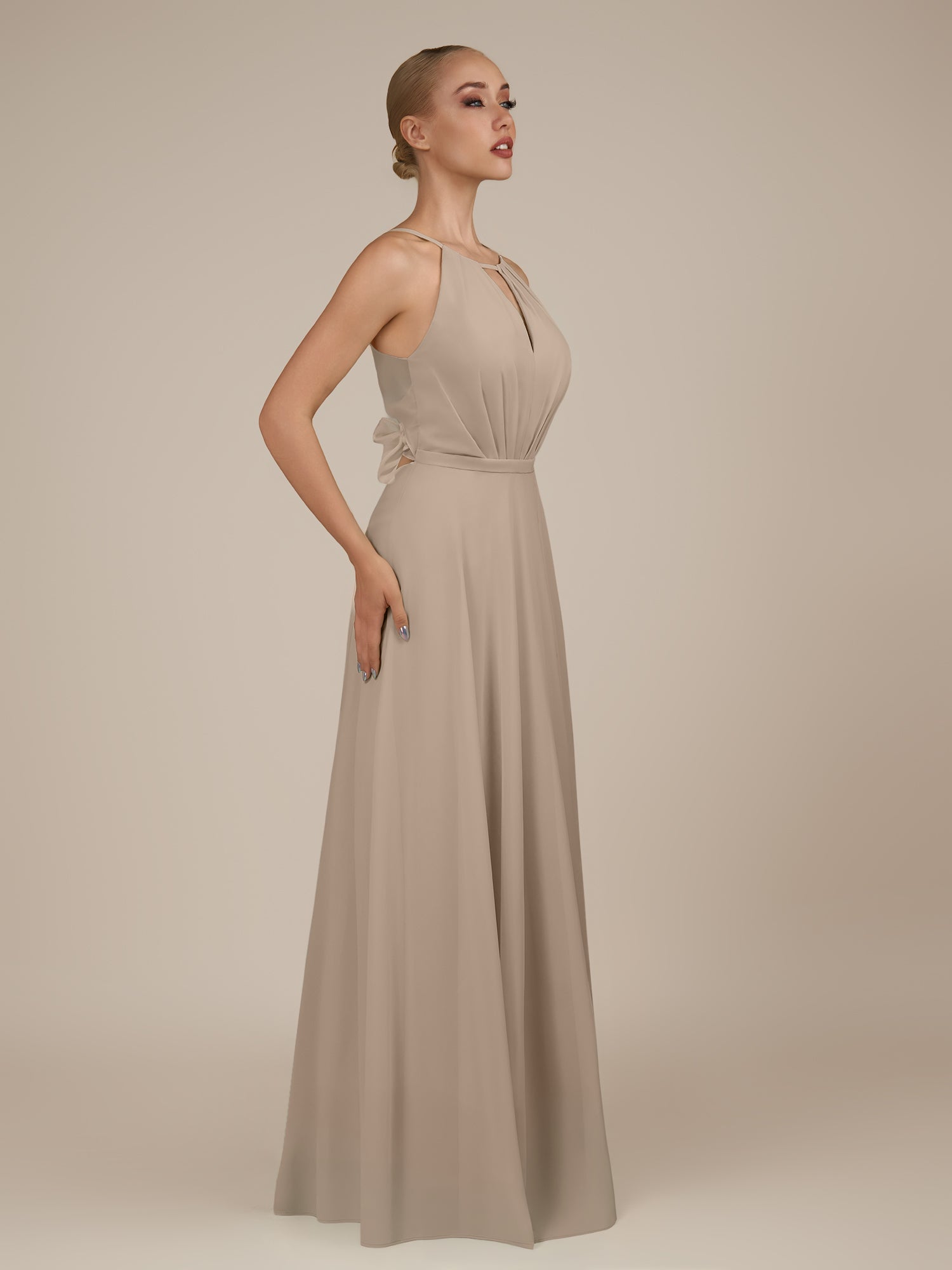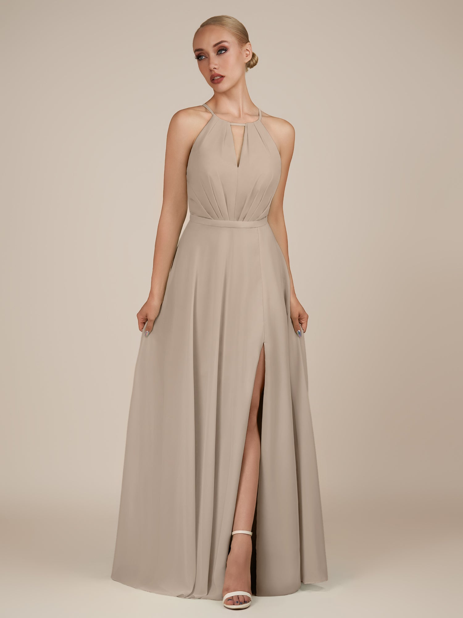 Illyria | Almond - A Line Chiffon Halter Neck Long Bridesmaid Dress with Cut Out