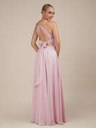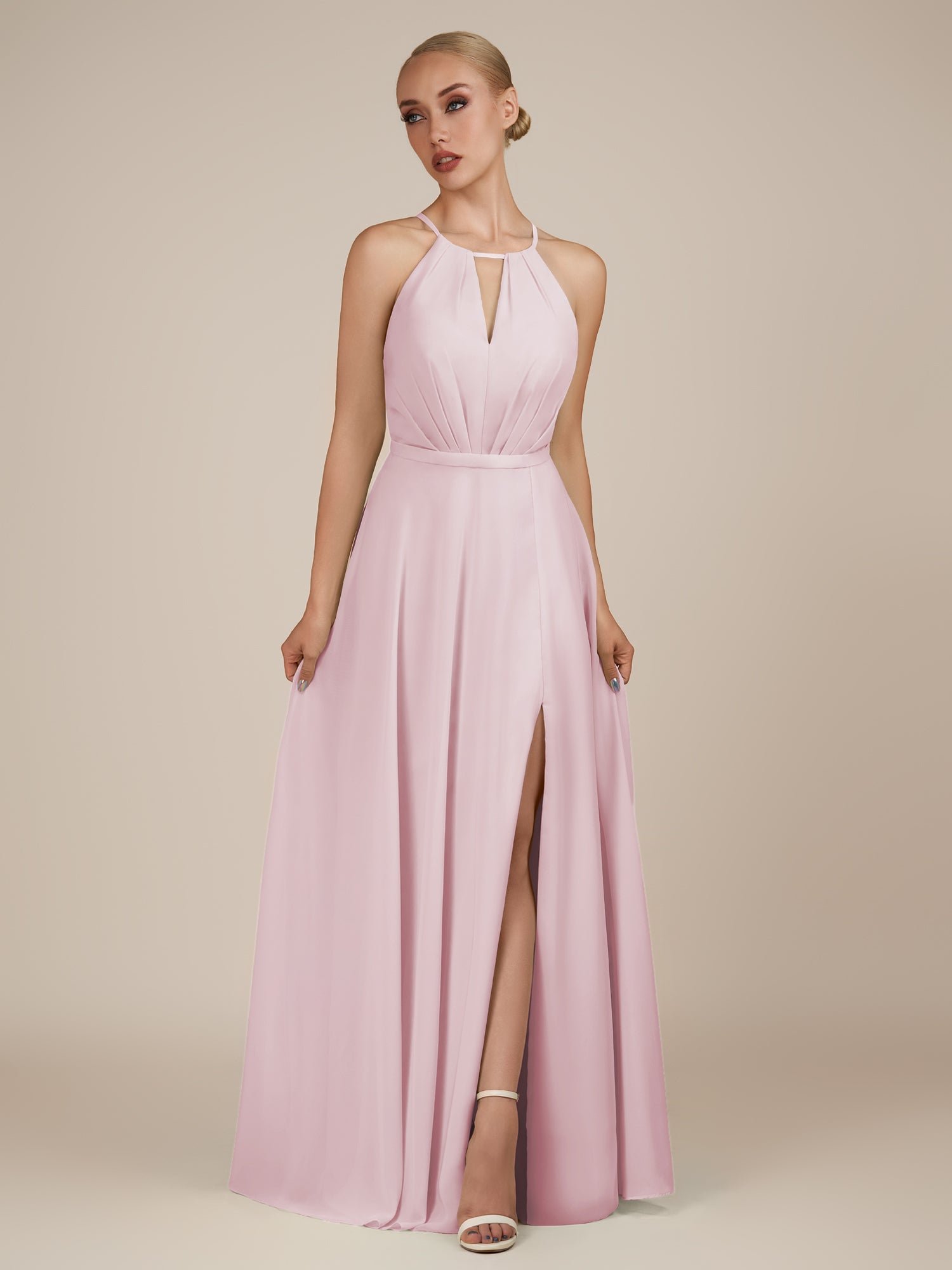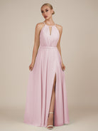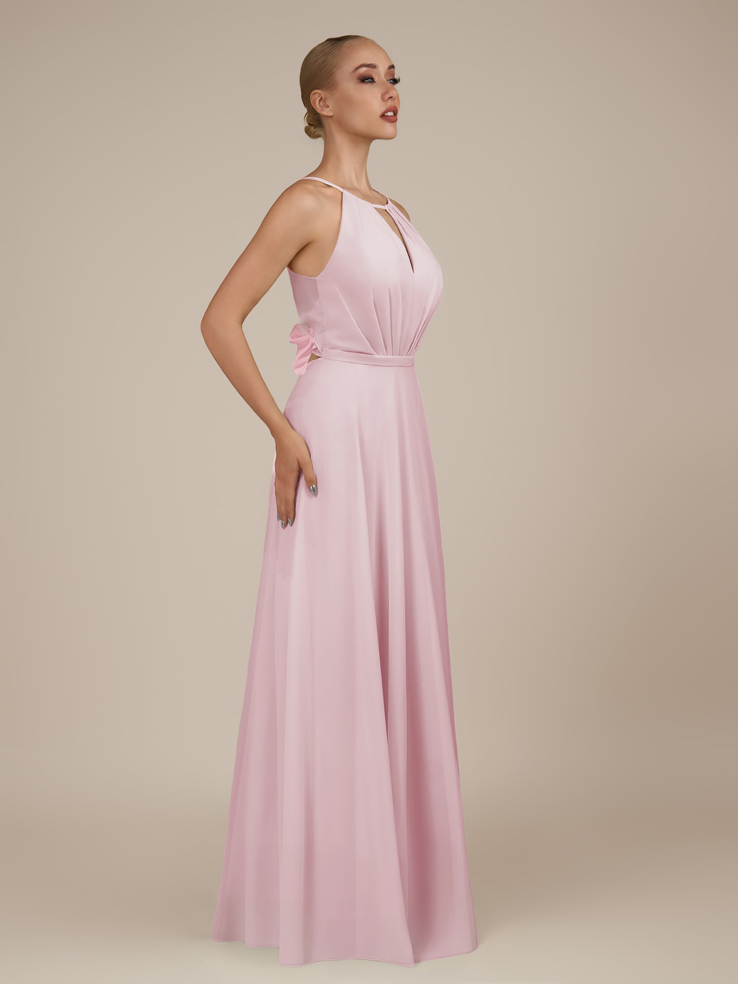 Illyria | Candy Pink - A Line Chiffon Halter Neck Long Bridesmaid Dress with Cut Out