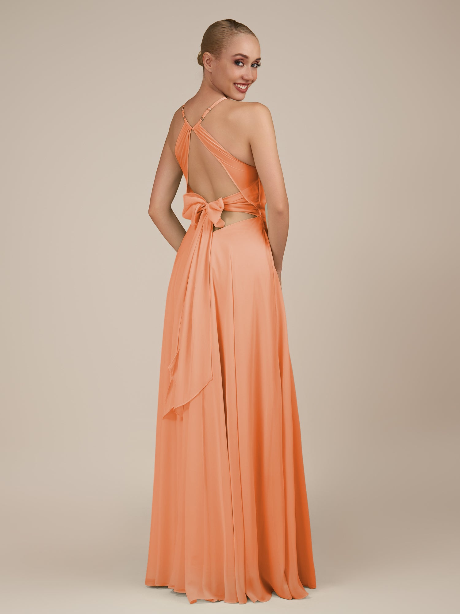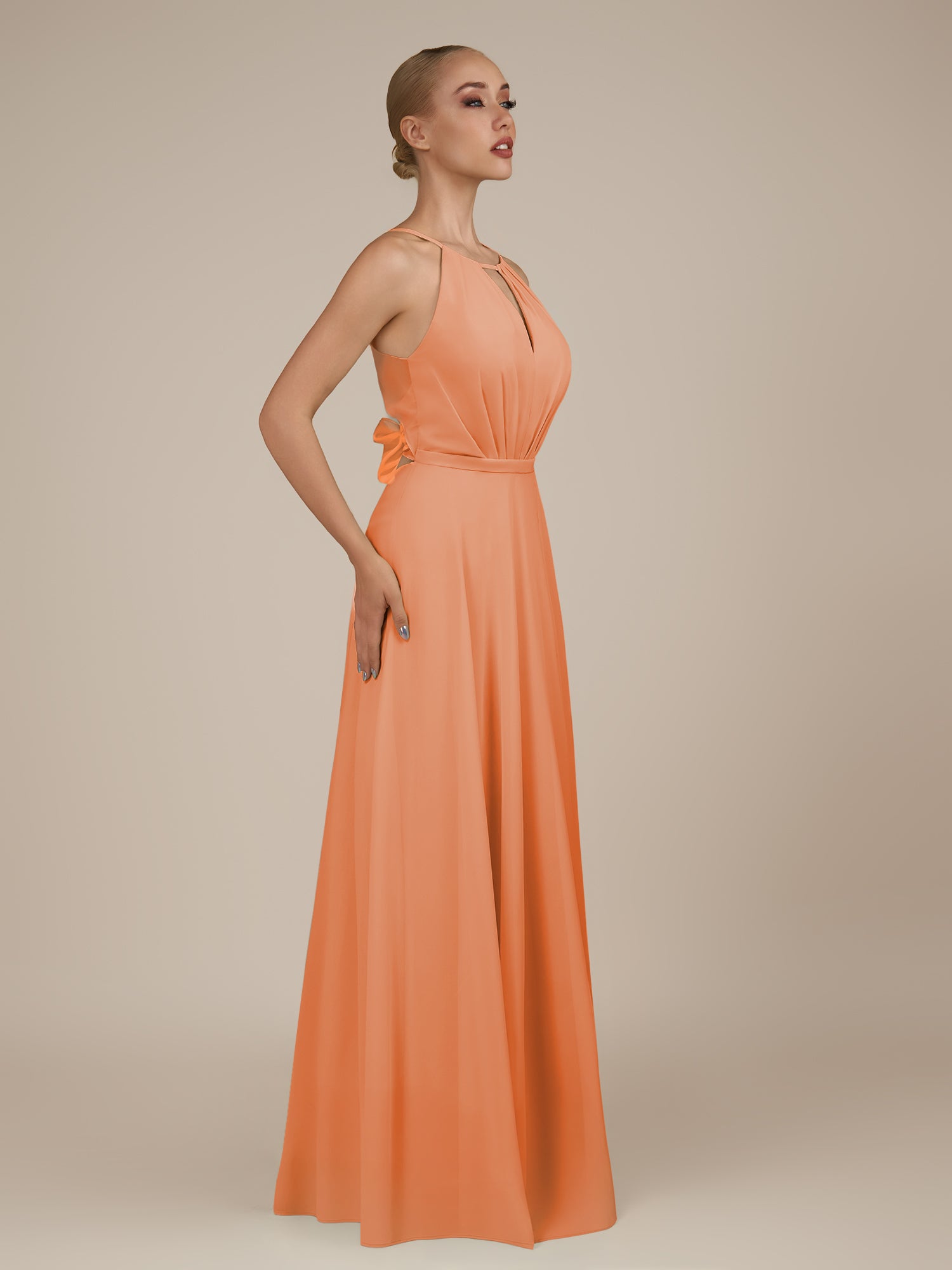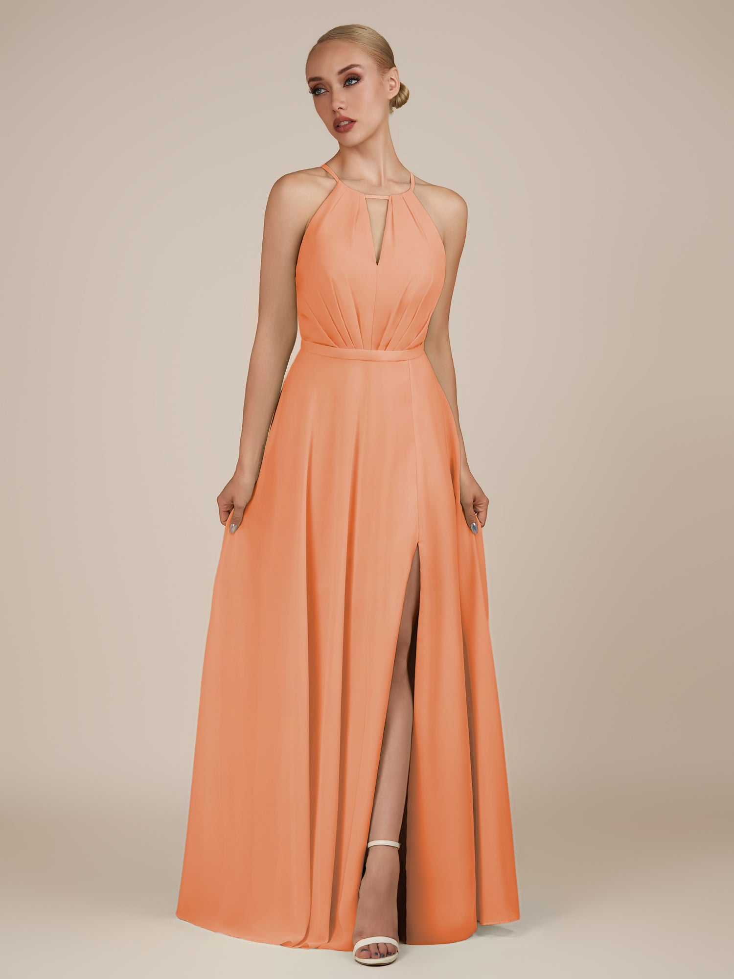 Illyria | Coral - A Line Chiffon Halter Neck Long Bridesmaid Dress with Cut Out