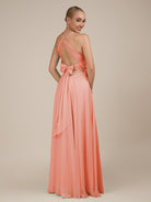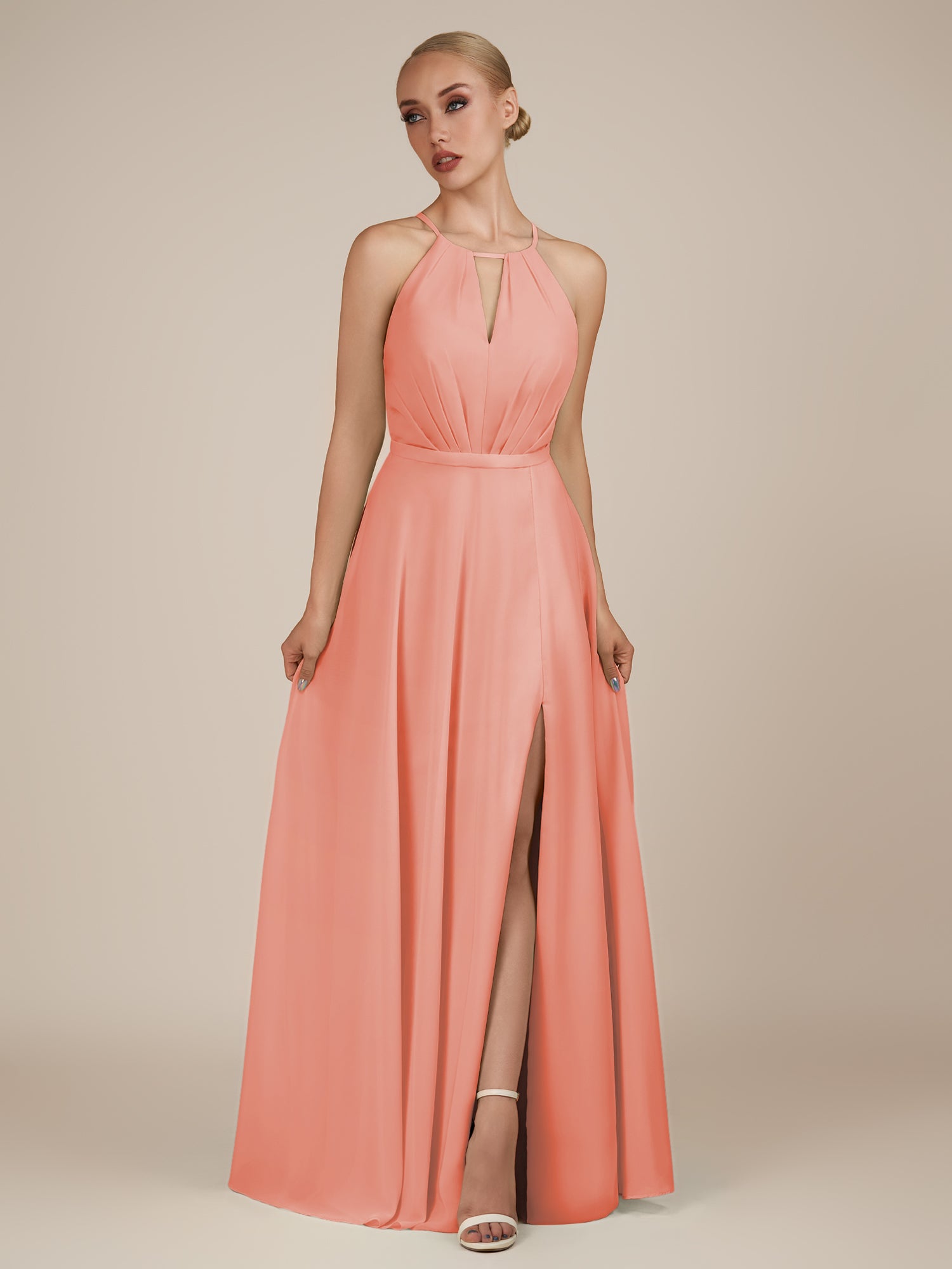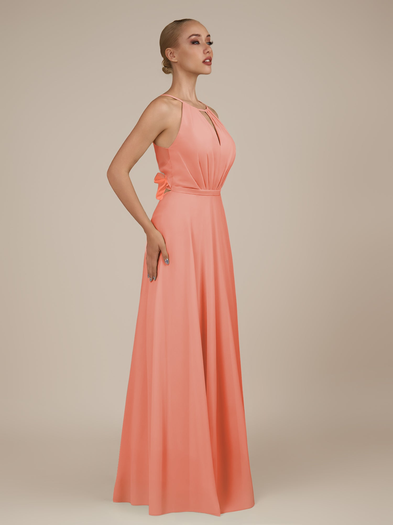 Illyria | Coral Pink - A Line Chiffon Halter Neck Long Bridesmaid Dress with Cut Out